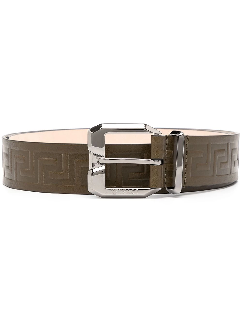 Détail Greca signature, fermeture à boucle argentée, logo gravé, trous percés, taille ajustable. Matière : cuir.