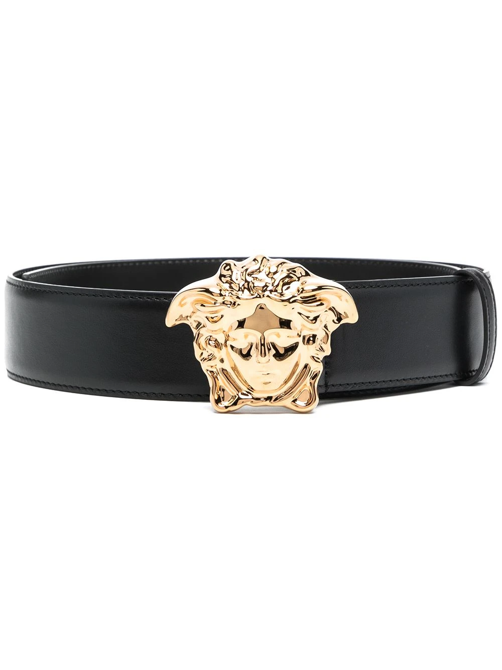 Motif Medusa, finitions en métal doré, coutures ton sur ton, taille ajustable. Couleur : Noir. Matière : cuir de veau.