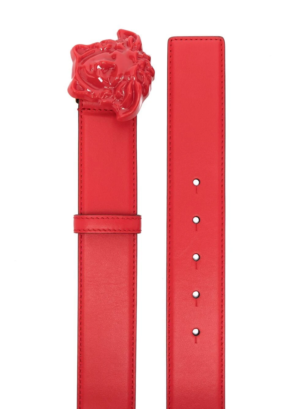 Motif Medusa, trous pré-percés, fermeture à boucle, taille ajustable. Couleur : rouge. Matière : cuir.
