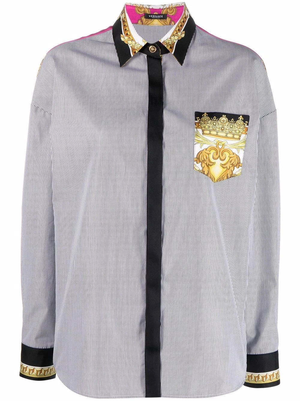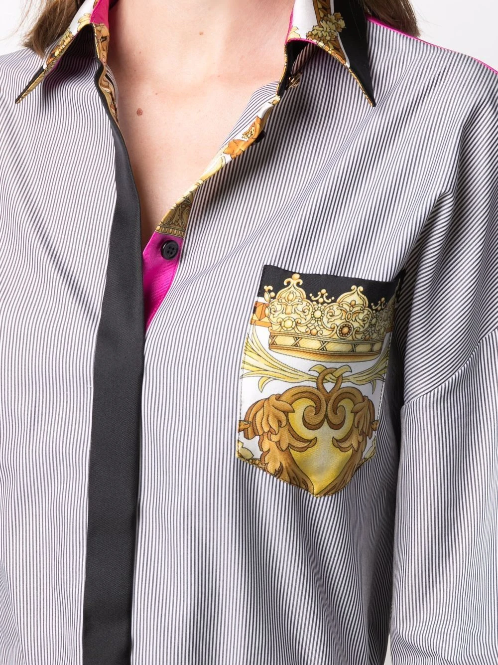Rayures verticales, motif Medusa, empiècements contrastants, col classique, poche poitrine plaquée, effet d’épaules descendues, manches longues, poignets boutonnés, boutonnière dissimulée sur le devant, boutons à logo embossé. Matière : coton.