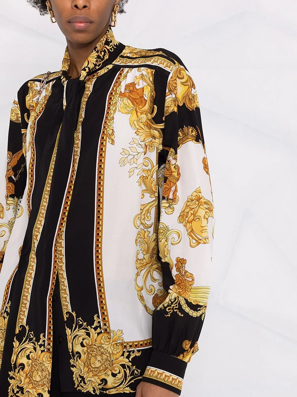 Imprimé Barocco signature, motif Medusa, col lavallière, boutonnière sur le devant, poignets boutonnés. Couleur : multicolore.