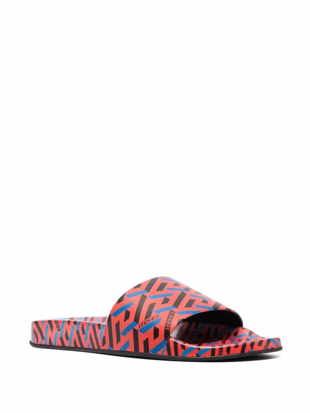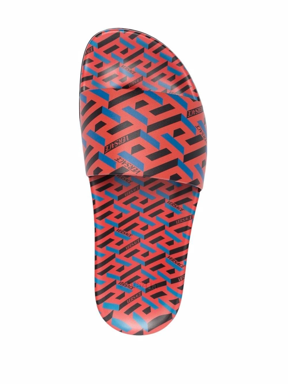 Imprimé monogrammé, bout ouvert, semelle plate en caoutchouc. Couleur : rouge.