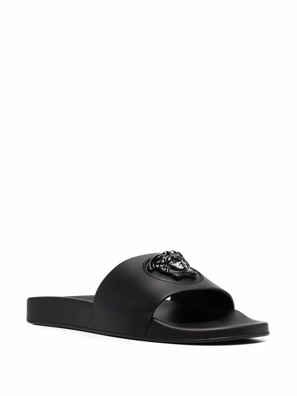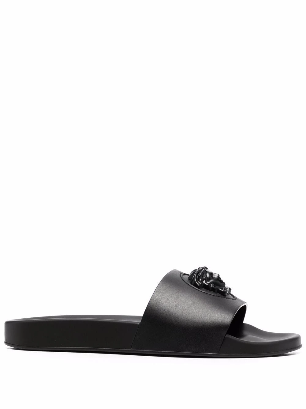 Motif Medusa, détails de brides, bout ouvert, semelle intérieure griffée, semelle plate. Couleur : noir. Matière : cuir.