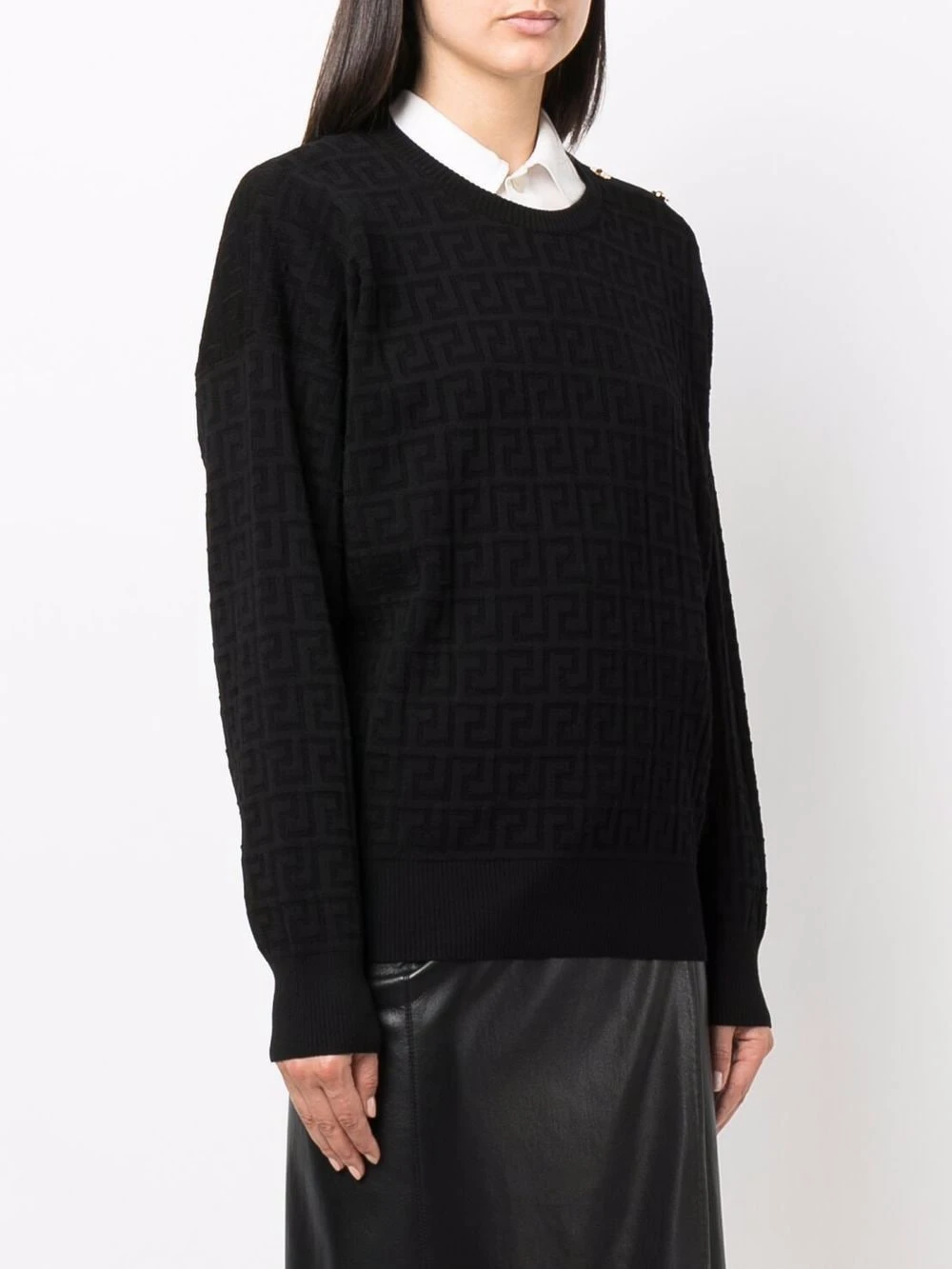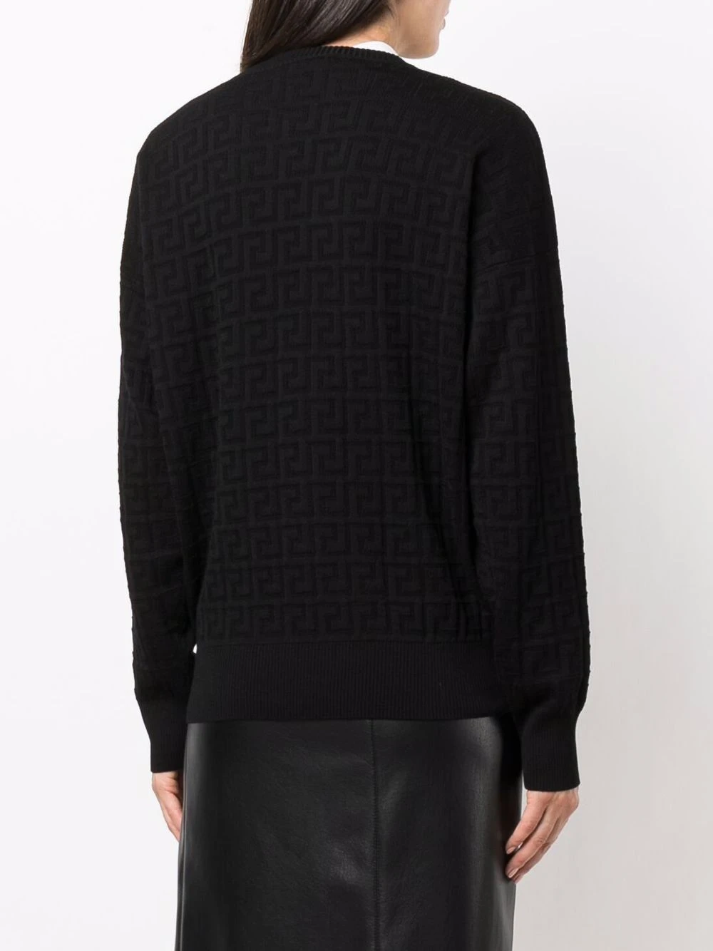 Motif Medusa, motif Greca signature imprimé, encolure ras du cou, effet d’épaules descendues, manches longues. Couleur : noir. Matière : laine.