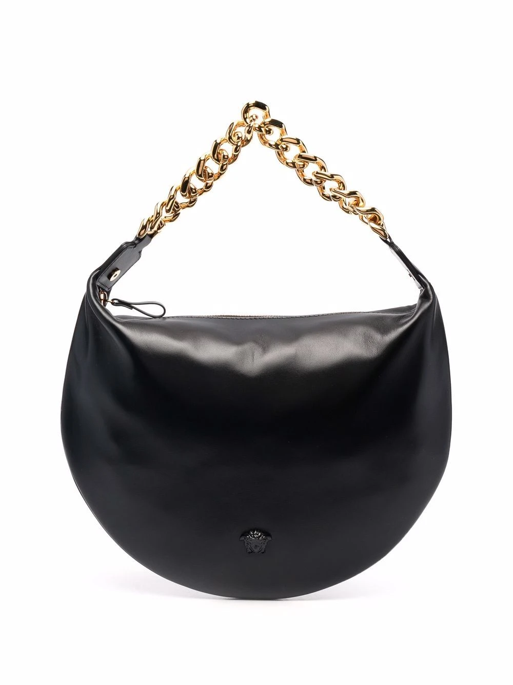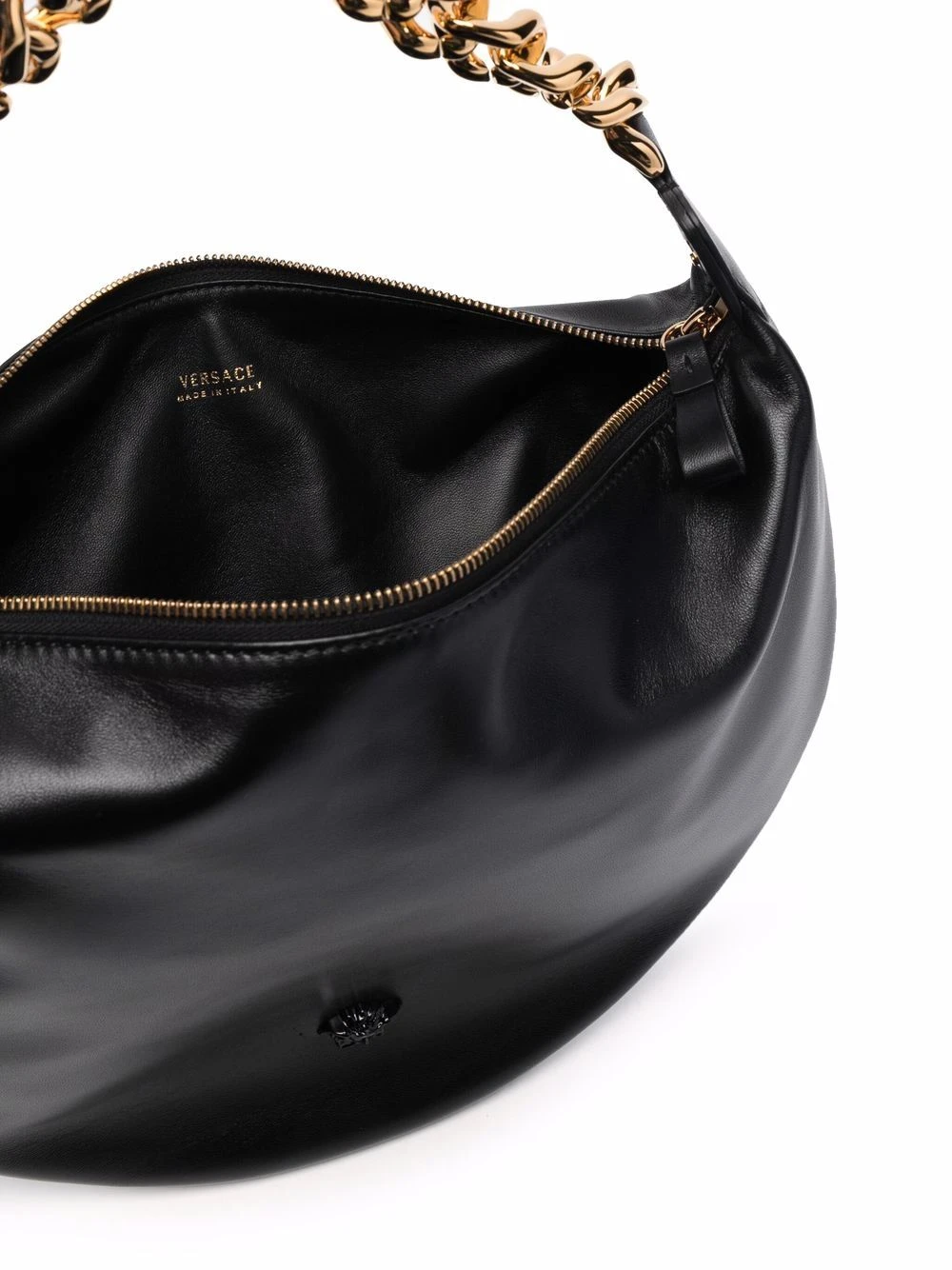 Détail Medusa, anse à maillons de chaîne, fermeture zippée sur le dessus. Couleur : noir. Matière : cuir.