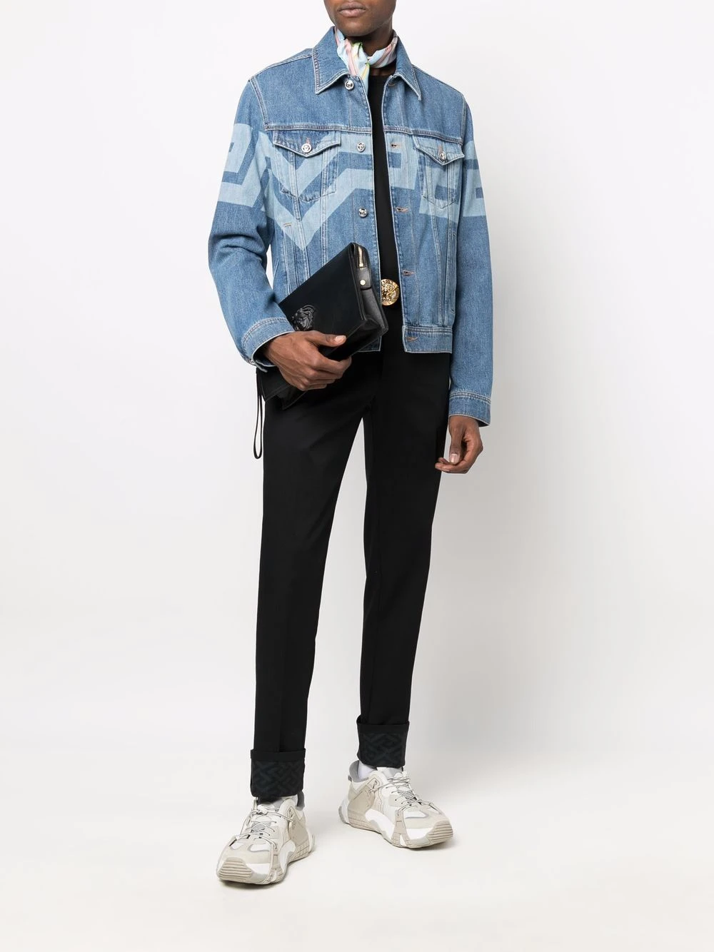 Motif Greca signature imprimé, boutons argentés à détails embossés, col classique, deux poches poitrine à rabat, boutonnière sur le devant, deux poches passepoilées latérales, tirants à boutons décoratifs, manches à poignets boutonnés. Couleur : bleu. Matière : coton.