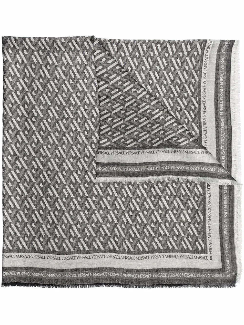 Motif Greca signature imprimé, finitions à logo, bords frangés, forme carrée.