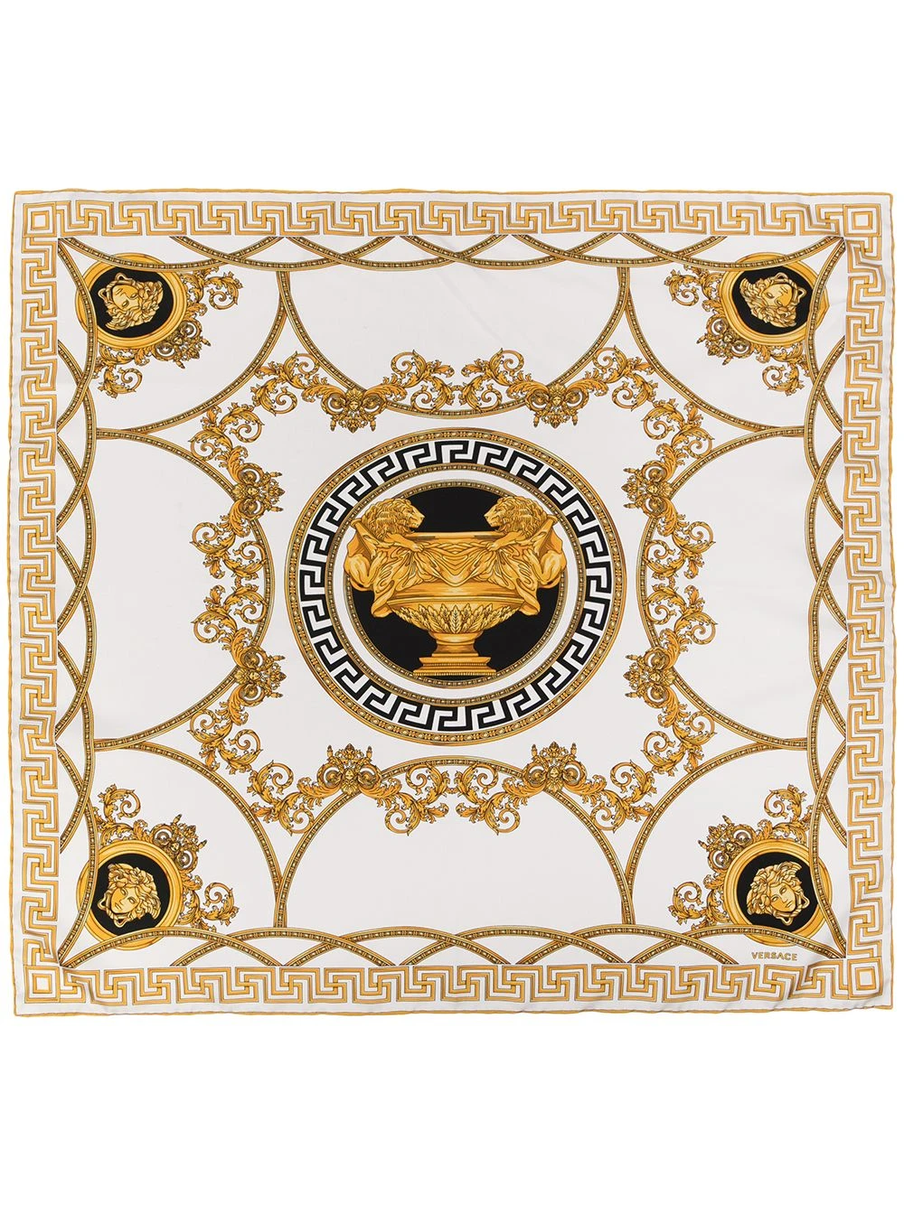 Détail Greca signature, motif Medusa, bords finis. Couleur : blanc. Matière : soie.