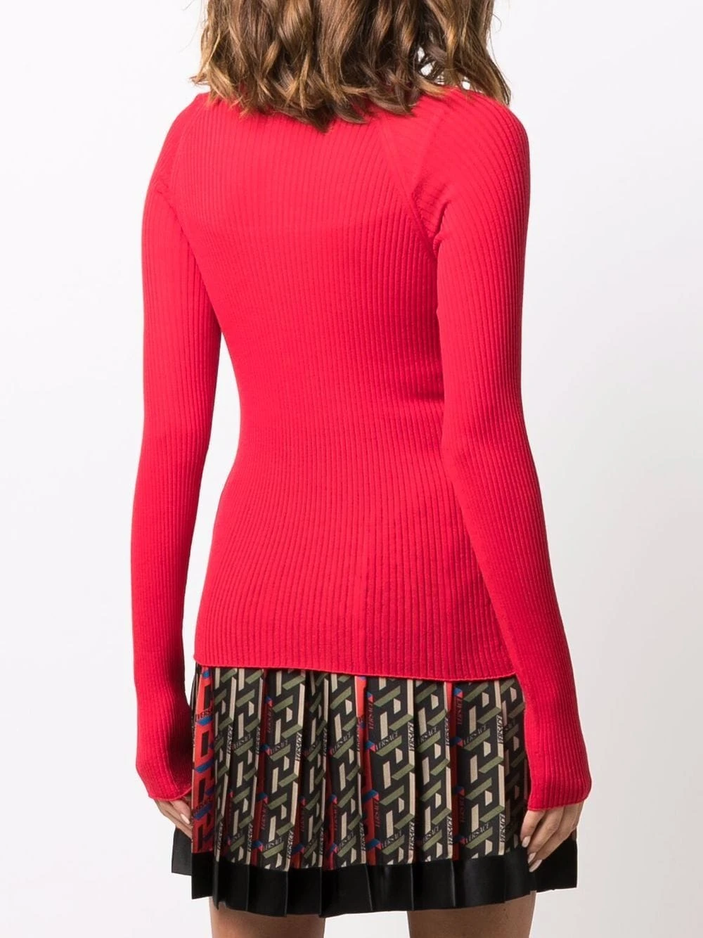 Patch poitrine à logo, maille nervurée, col montant, manches raglan longues, ourlet droit. Couleur : rouge. Matière : laine vierge.