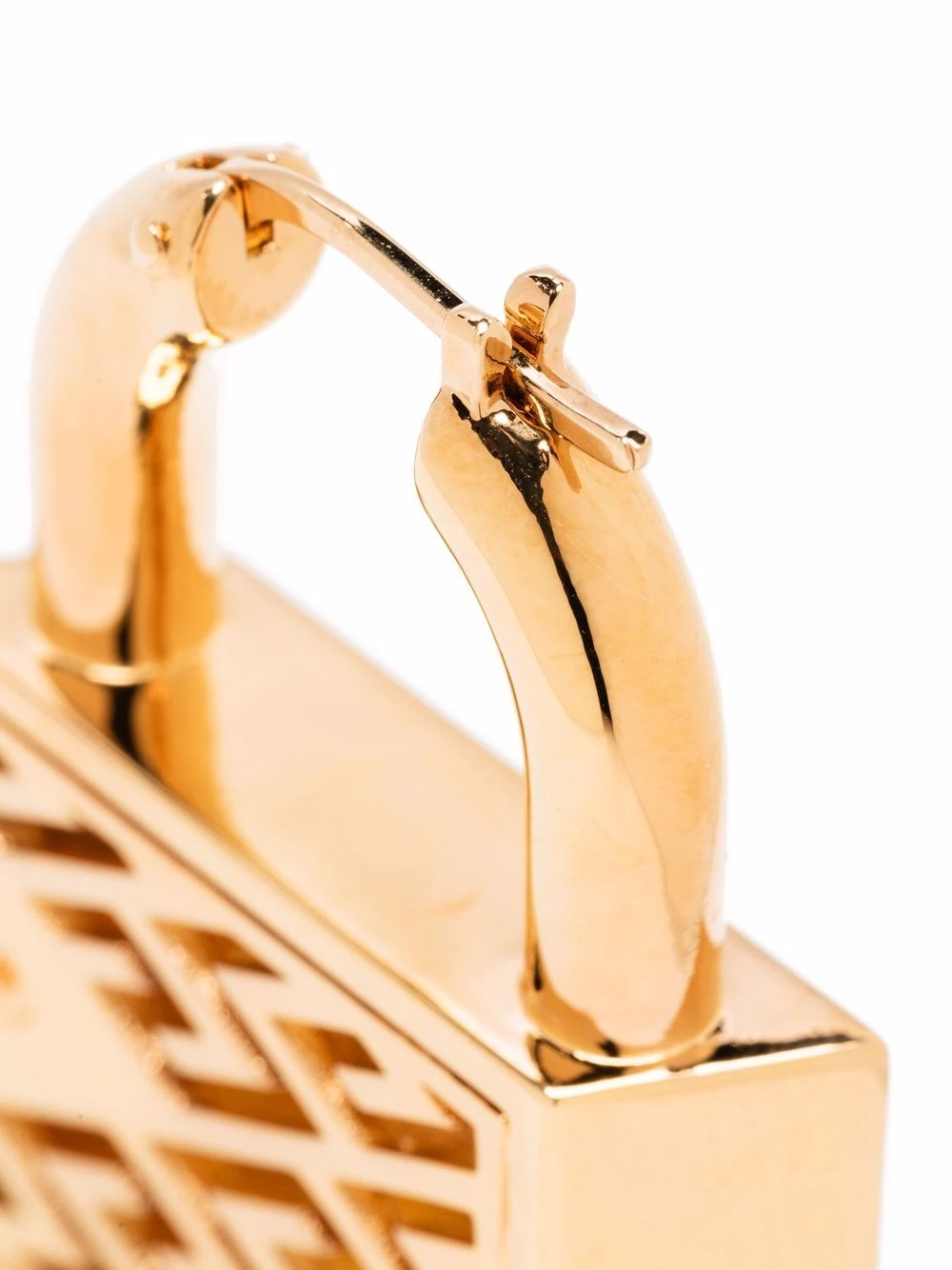 DĂ©tail Greca signature, logo gravĂ©, dĂ©tail de cadenas, fermoir Ă©pingle pivotant, pour oreilles percĂ©es. MatiĂšre : mĂ©tal. Ces boucles d’oreilles sont vendues par paire.