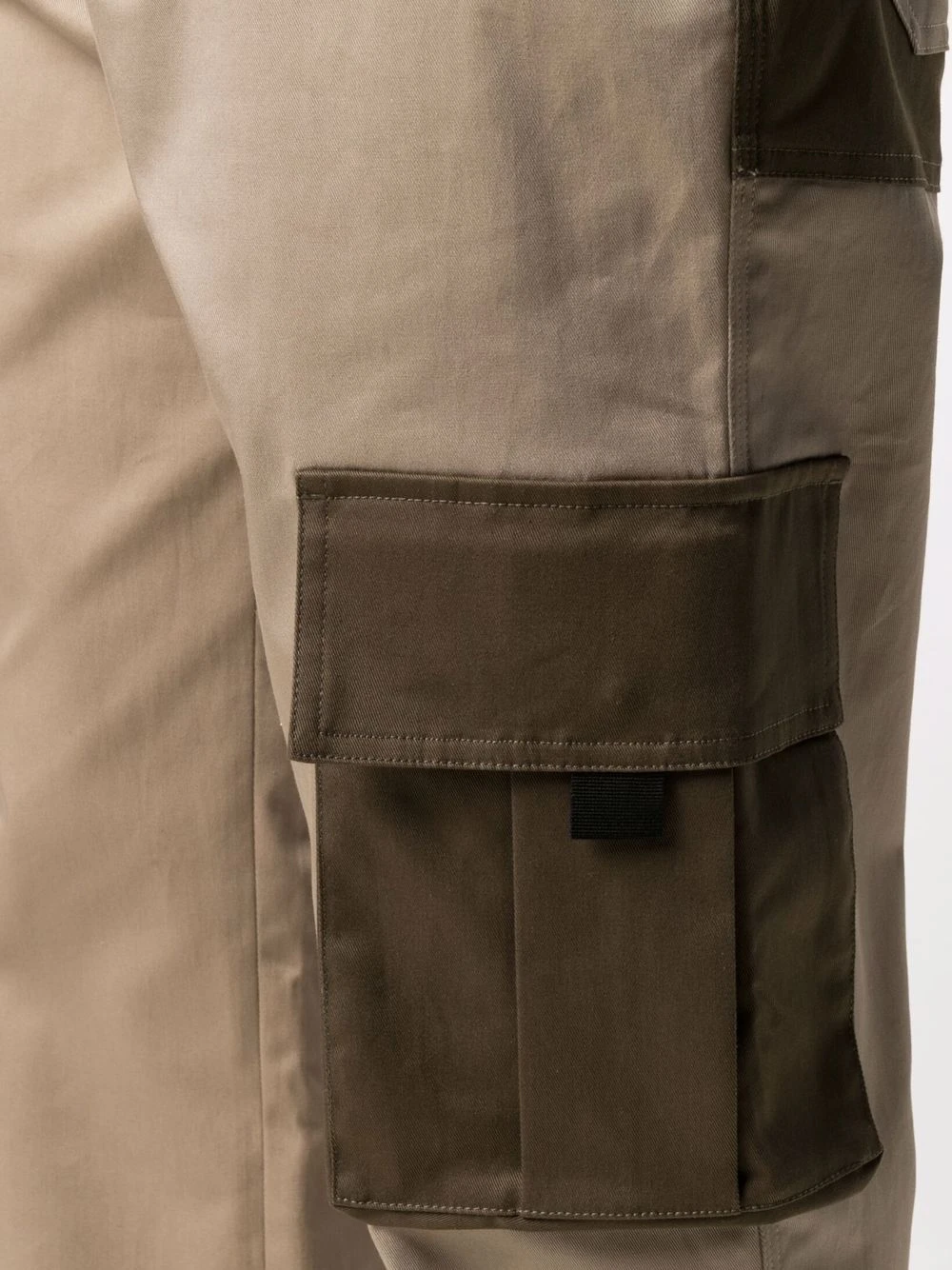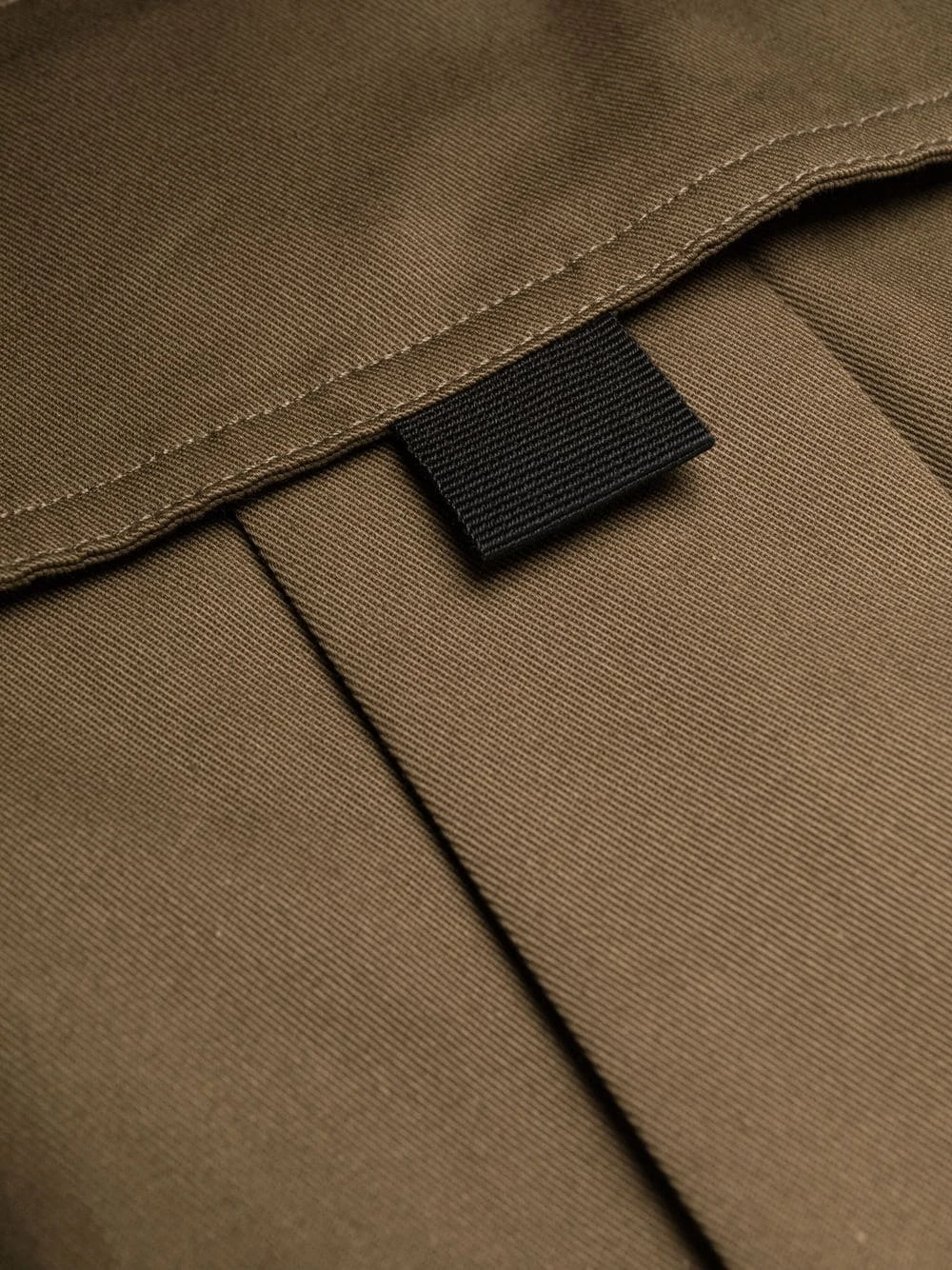 Boutonnière sur le devant, passants de ceinture, poche devant à rabat, poches arrière plaquées, coupe droite.