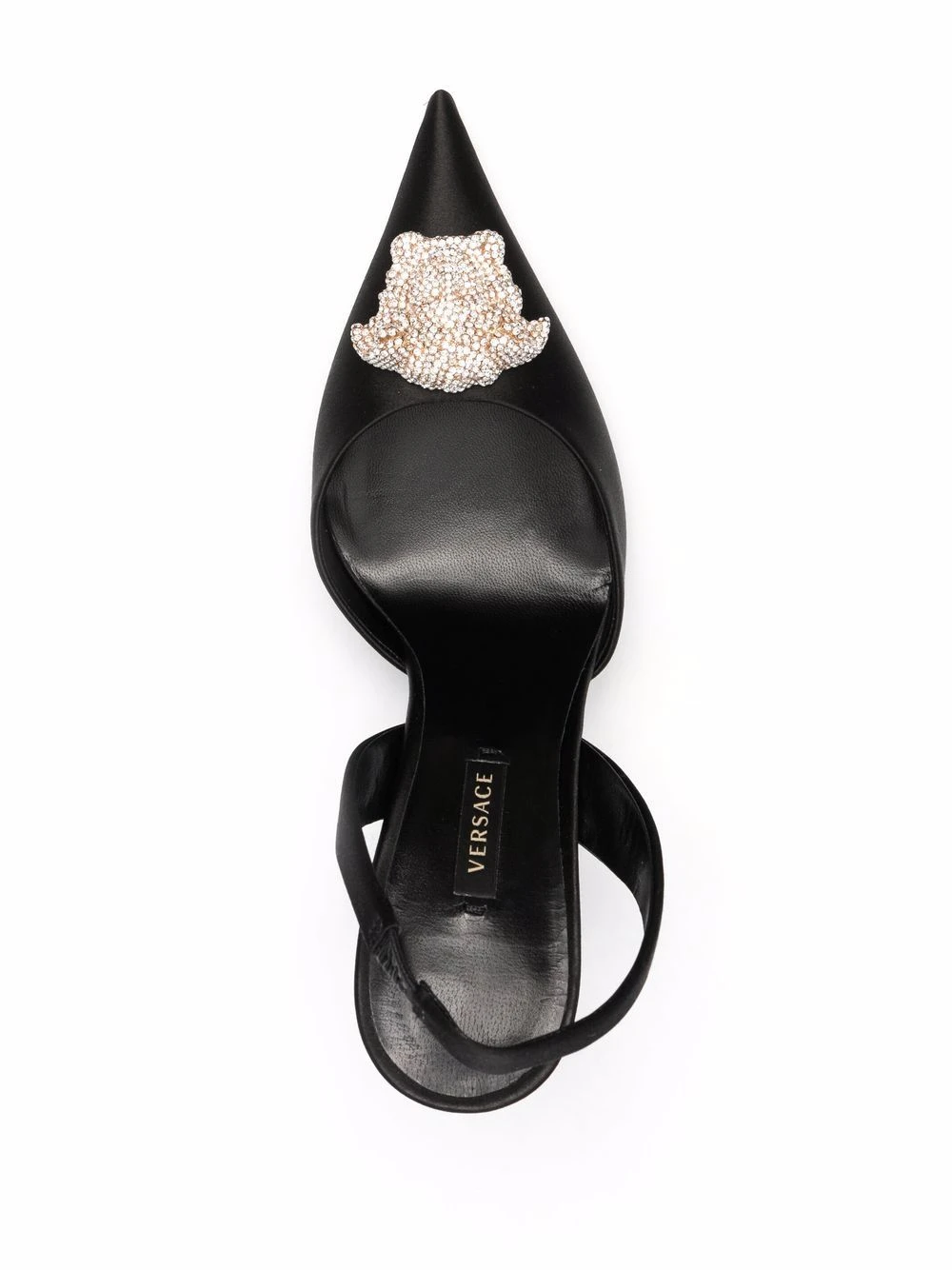 Ornement en cristal, détail Medusa, bride arrière, bout pointu, talon haut, semelle en cuir. Couleur : noir. Matière : satin.