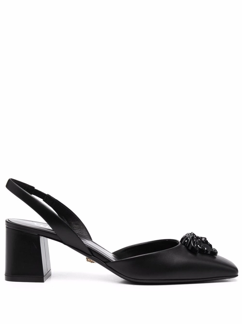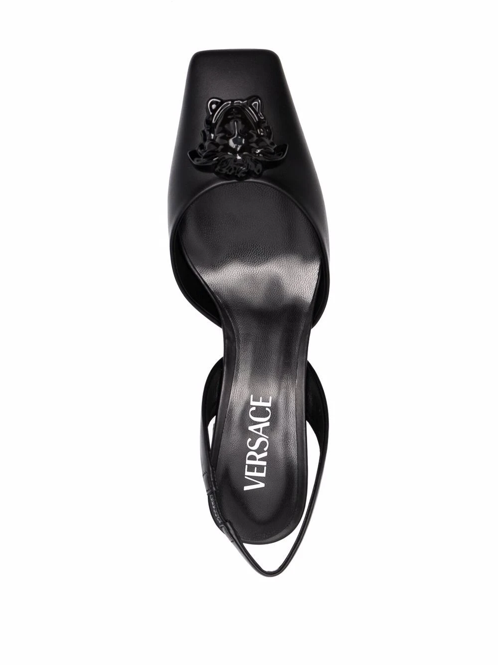 Motif Medusa, bout carré, bride arriÚre élastique, semelle intérieure griffée, talon mi-haut épais, semelle en cuir. Couleur : noir. MatiÚre : cuir.
