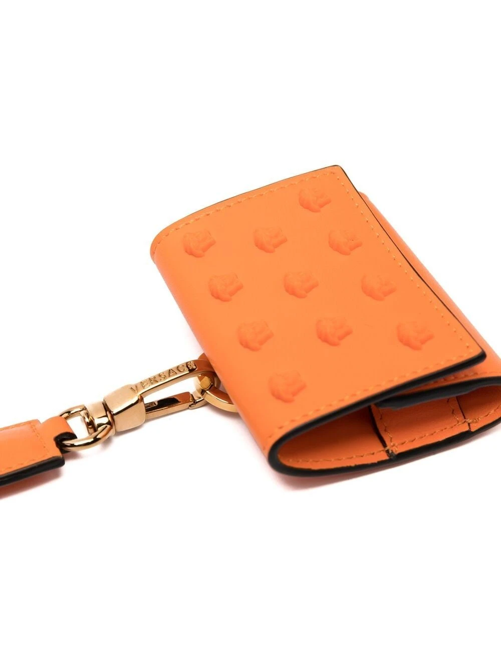 Motif Medusa, bride porté autour du cou détachable, dessus à rabat avec bouton pression, finitions en métal doré. Matière : cuir.