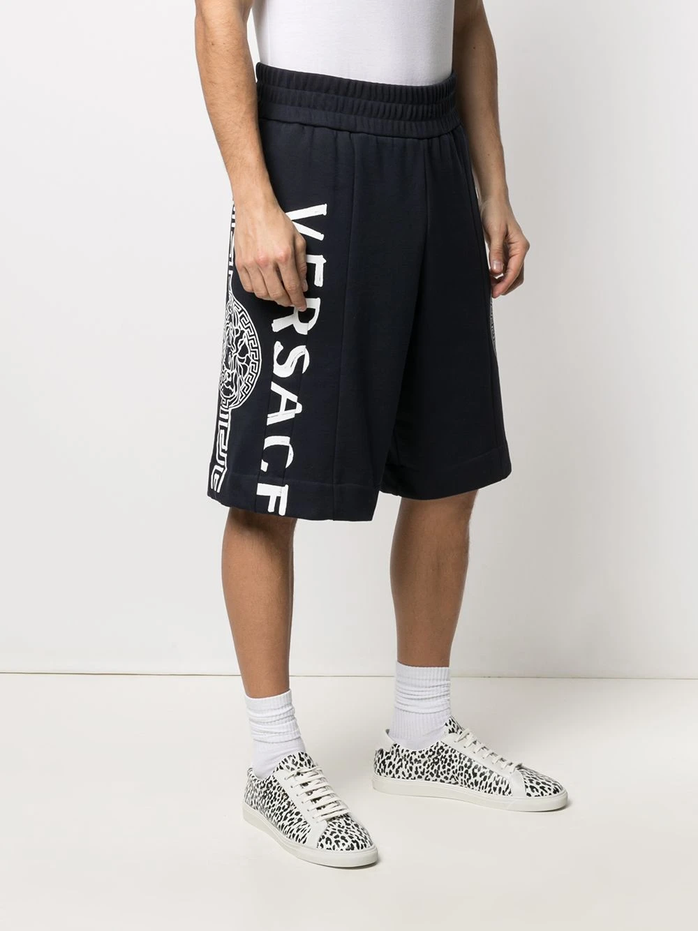 Logo imprimé sur le côté, motif Medusa, motif imprimé, ceinture élastique, deux poches latérales passepoilées, hauteur genou. Matière : coton.
