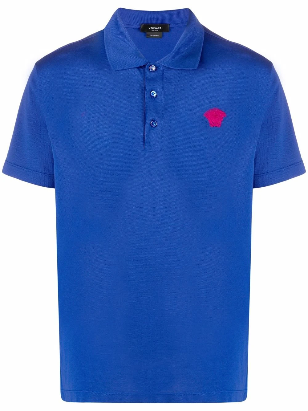 Motif Medusa, col polo, manches courtes, ourlet droit, patte de boutonnage sur le devant. Matière : coton.