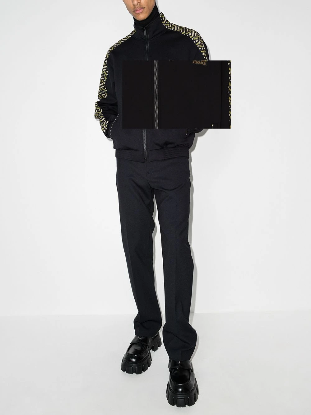 Motif Greca signature imprimé, patch poitrine à logo, col montant, fermeture zippée devant, manches longues. Couleur : noir.