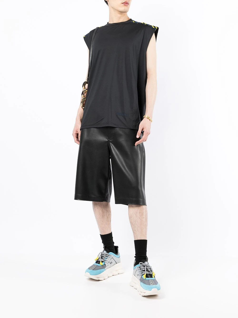 Black Greca-detail tank top from VERSACE featuring signature Greca detailing, round neck, sleeveless and straight hem.