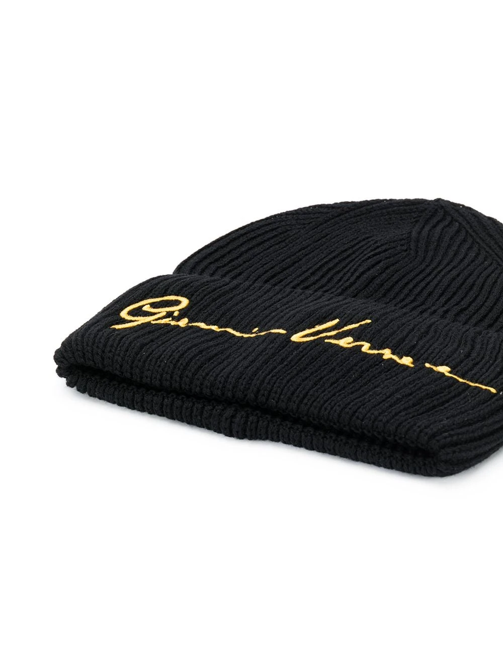 Bonnet à logo brodé en laine Versace avec tricot à nervures, ourlet retroussé et logo brodé sur le devant. Couleur : noir.