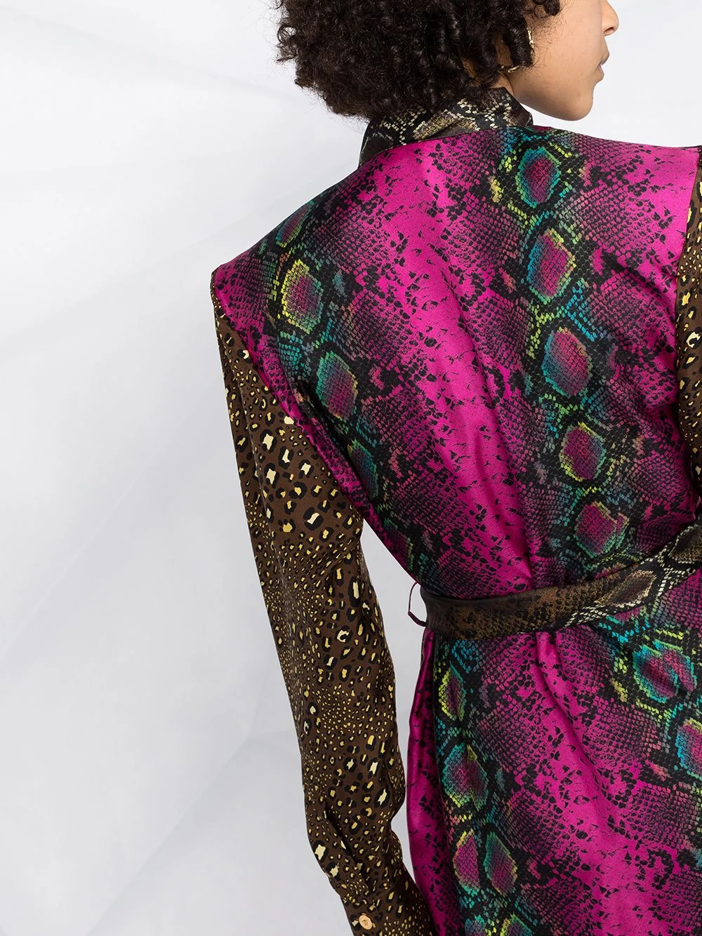 Design colour block, col lavallière à nouer, boutonnière sur le devant, taille ceinturée, deux poches latérales passepoilées, manches longues, poignets boutonnés. Matière : soie.