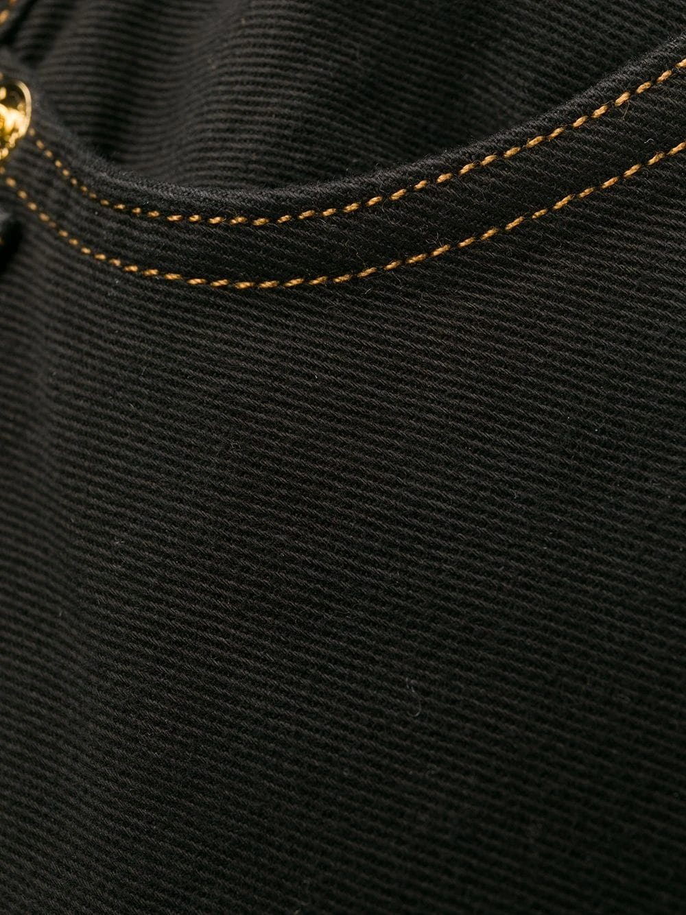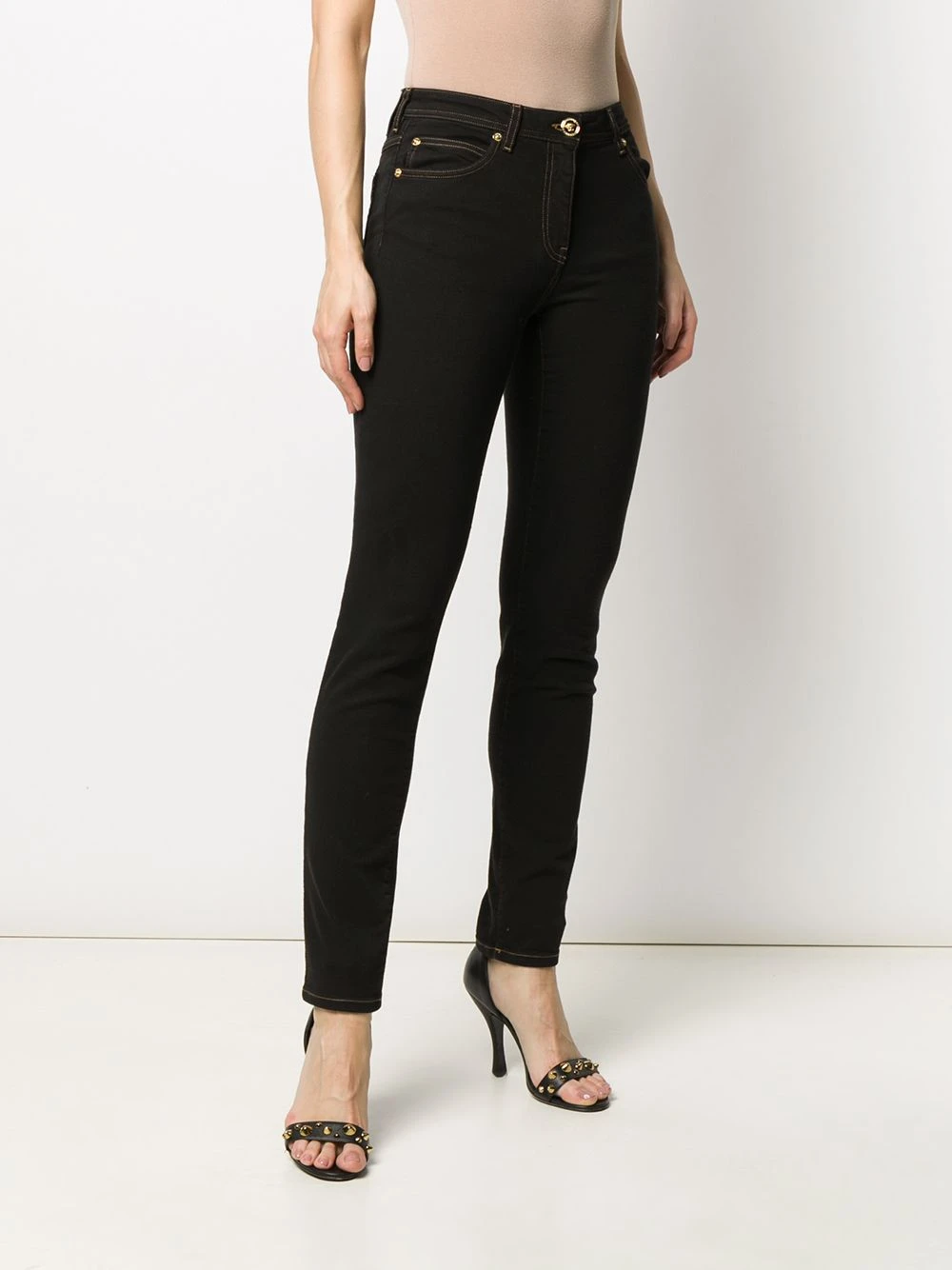 Jean skinny à motif Medusa Versace avec bouton et zip, détail Medusa, coupe skinny, coupe classique cinq poches, taille normale, étiquette en cuir à l’arrière et logo brodé à l’arrière. Couleur : noir.