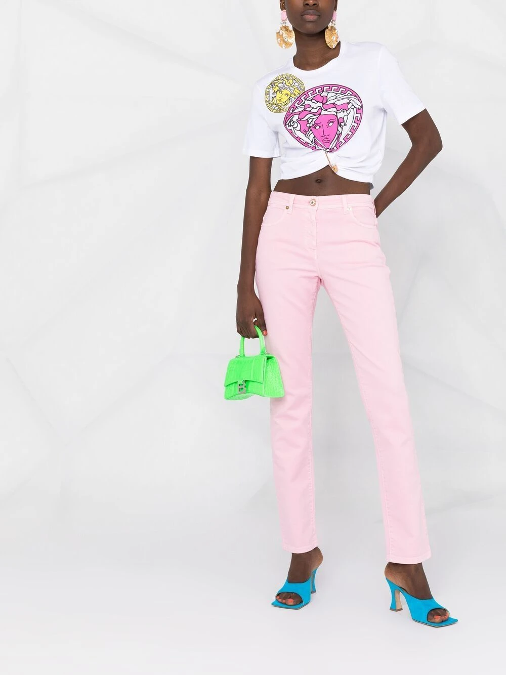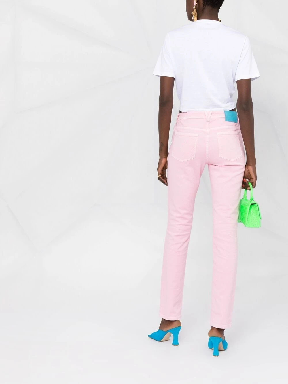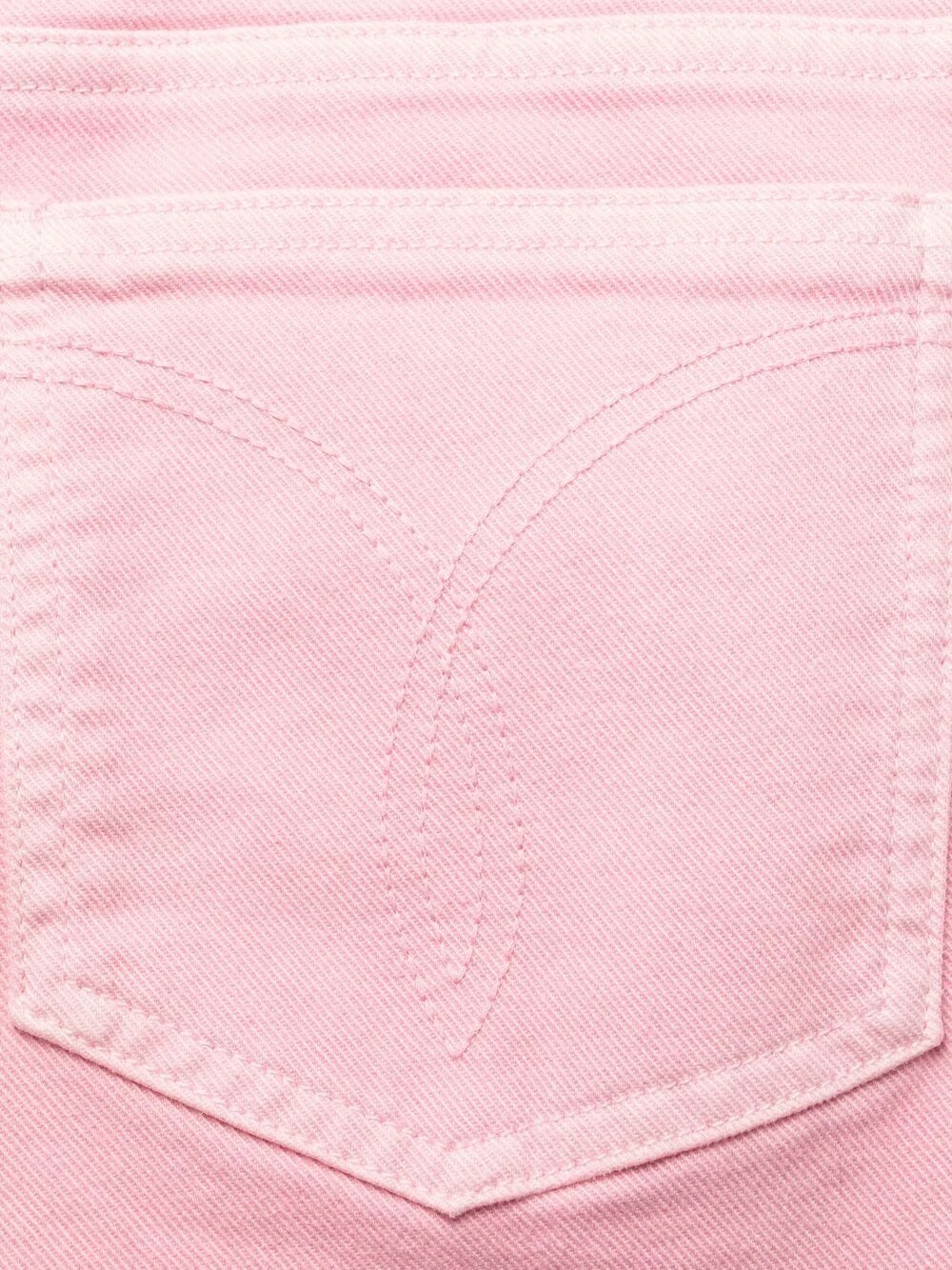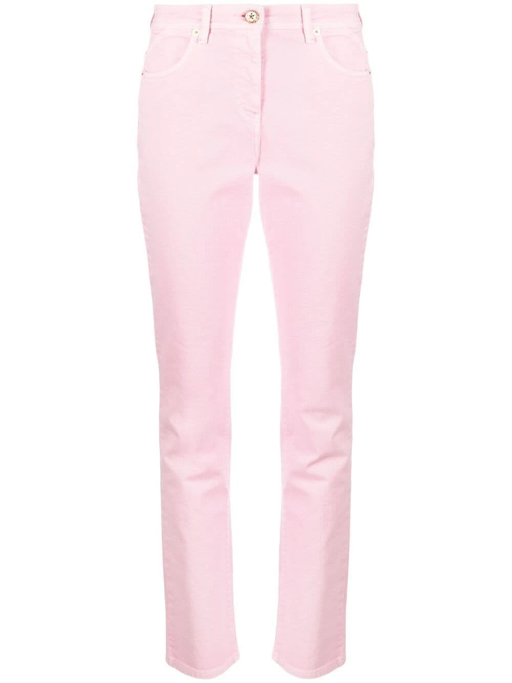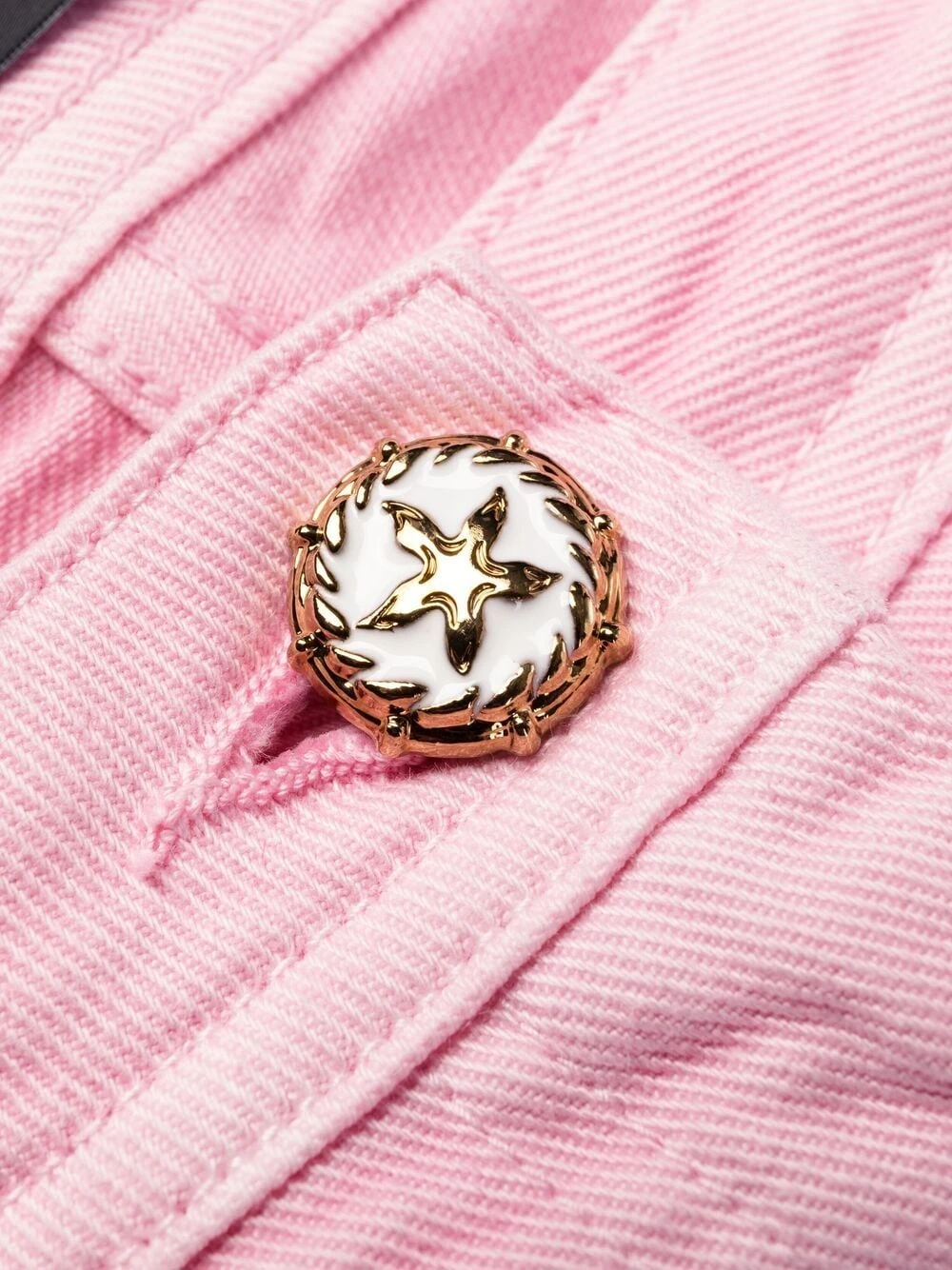 Finitions en métal doré, patch logo sur l’arrière, taille mi-haute, coupe slim, passants de ceinture, fermeture à zip et boutons sur le devant, cinq poches classiques.