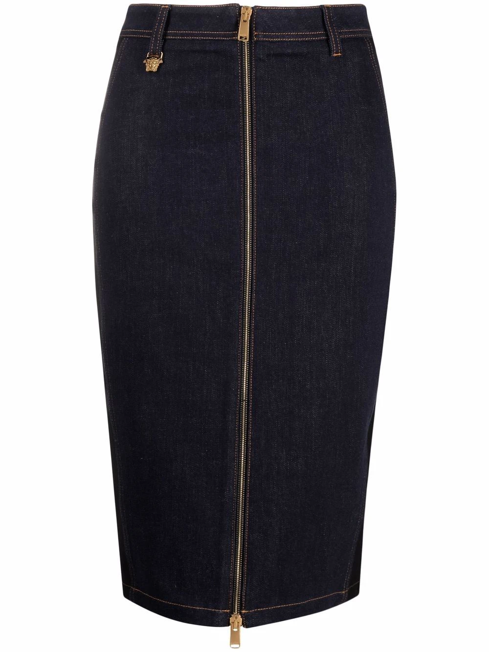 Finitions en métal doré, motif Medusa, taille haute, poches arrière plaquées, fermeture zippée devant, coupe mi-longue. Couleur : bleu.
