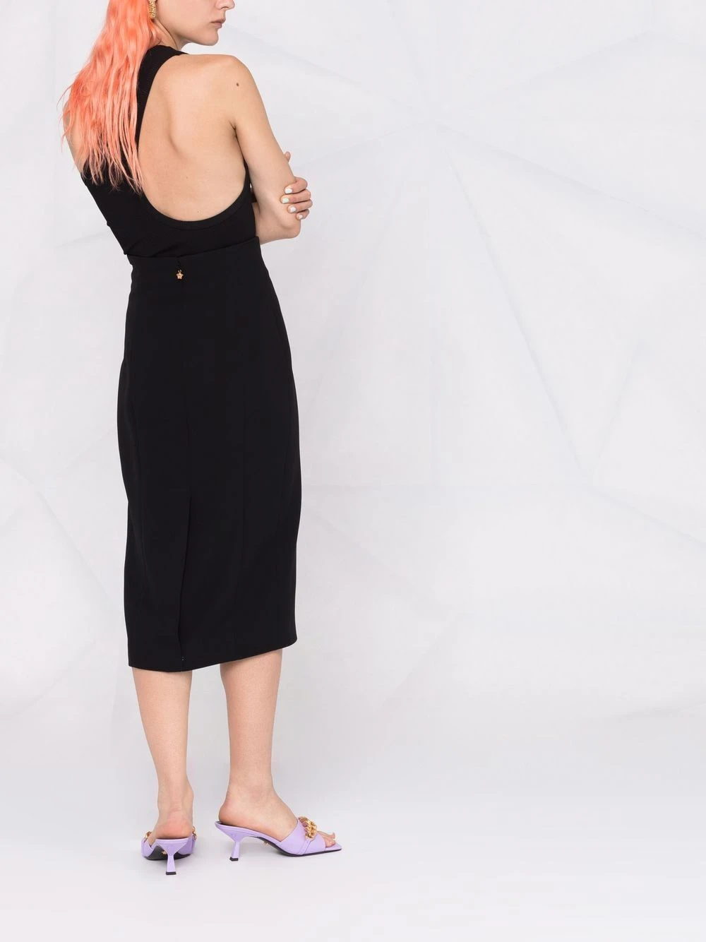 Taille haute, ornement en cristal, détail Greca signature, finitions en métal doré, fermeture zippée dissimulée à l’arrière, coupe mi-longue. Couleur : noir. Matière : soie.