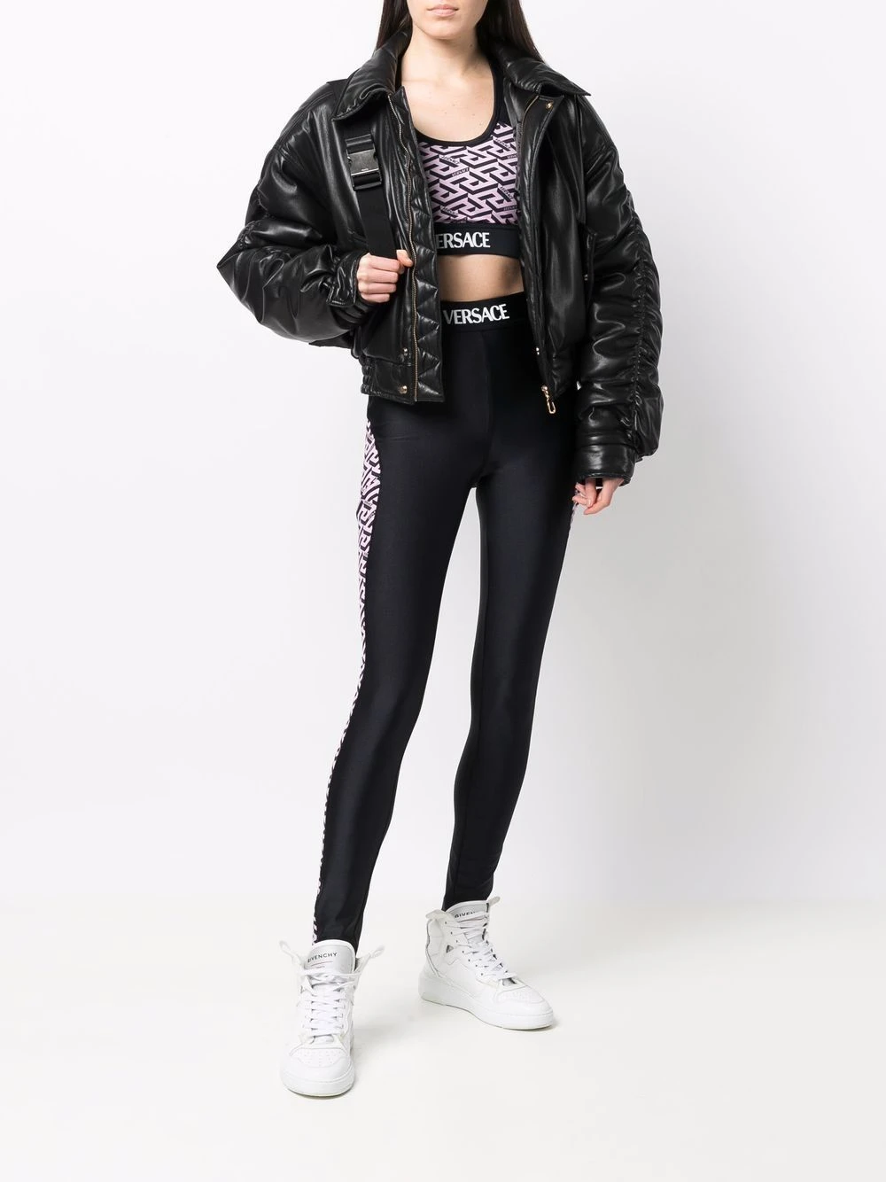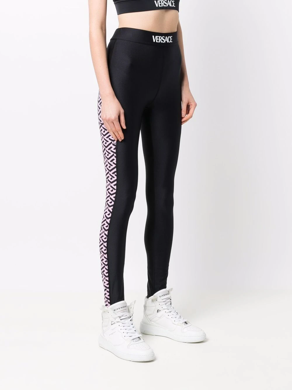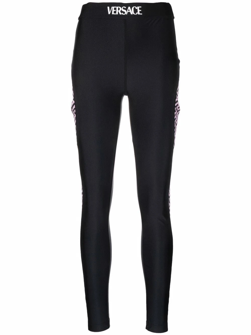 Construction stretch, imprimé La Greca signature, design à empiècements, ceinture à logo, coupe skinny.