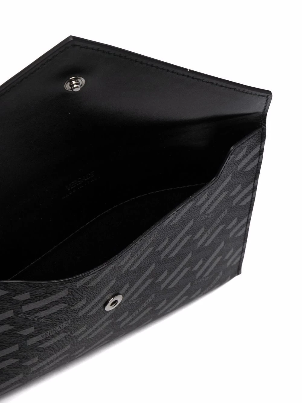 Imprimé La Greca signature, style enveloppe, rabat sur le devant, fermeture à boutons pression, compartiment principal. Matière : cuir de veau.