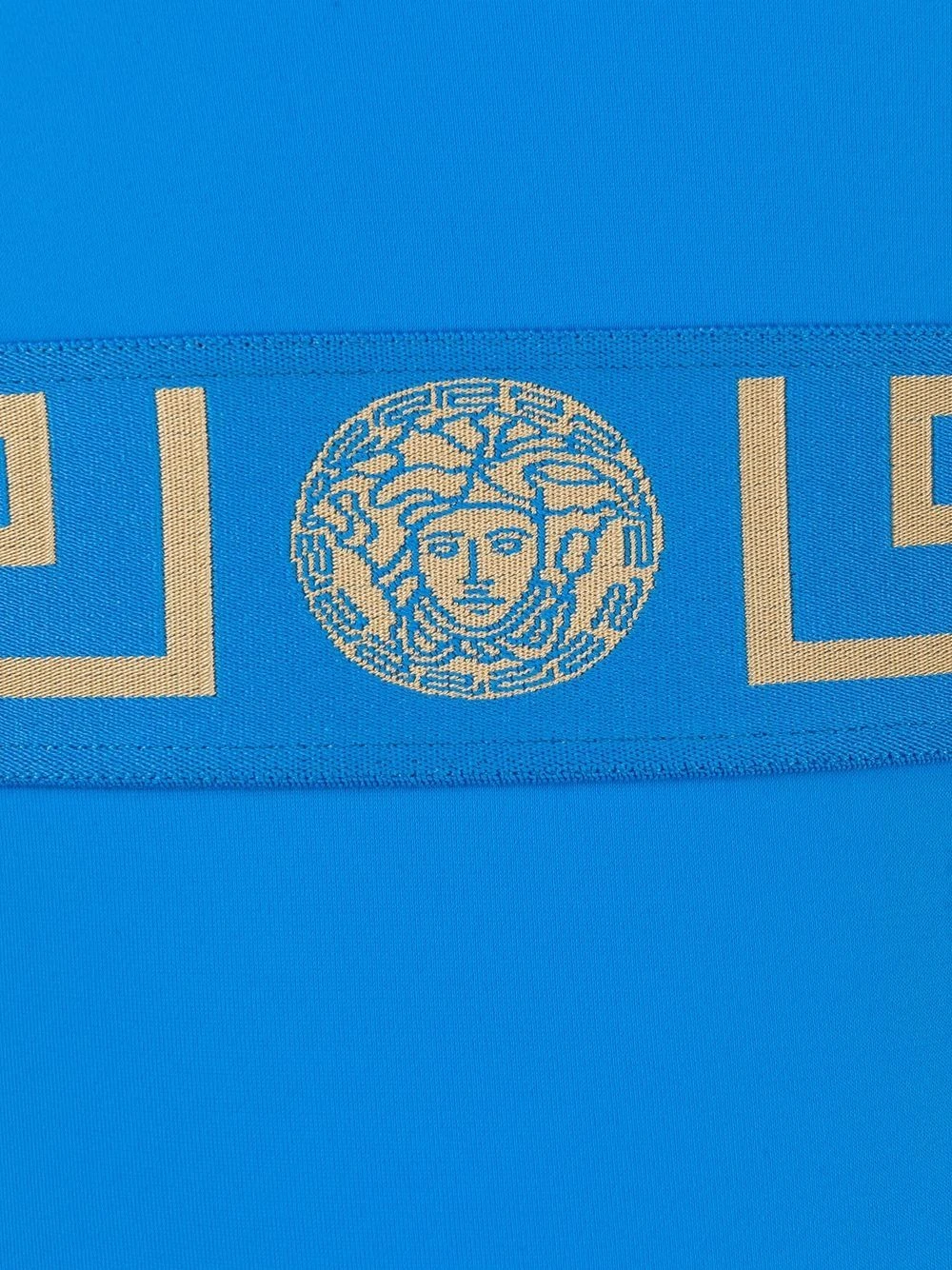 Construction stretch, motif Greca signature imprimé, motif Medusa, encolure carrée, design sans manches, ceinture élastique. Couleur : bleu. Veillez à essayer les maillot de bain par-dessus vos propres sous-vêtements.