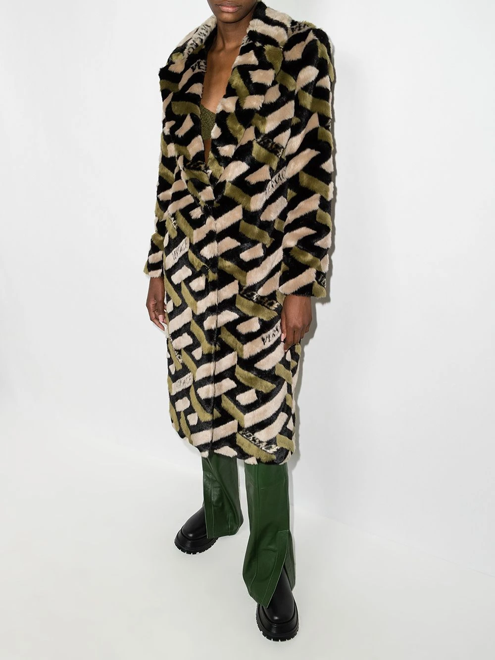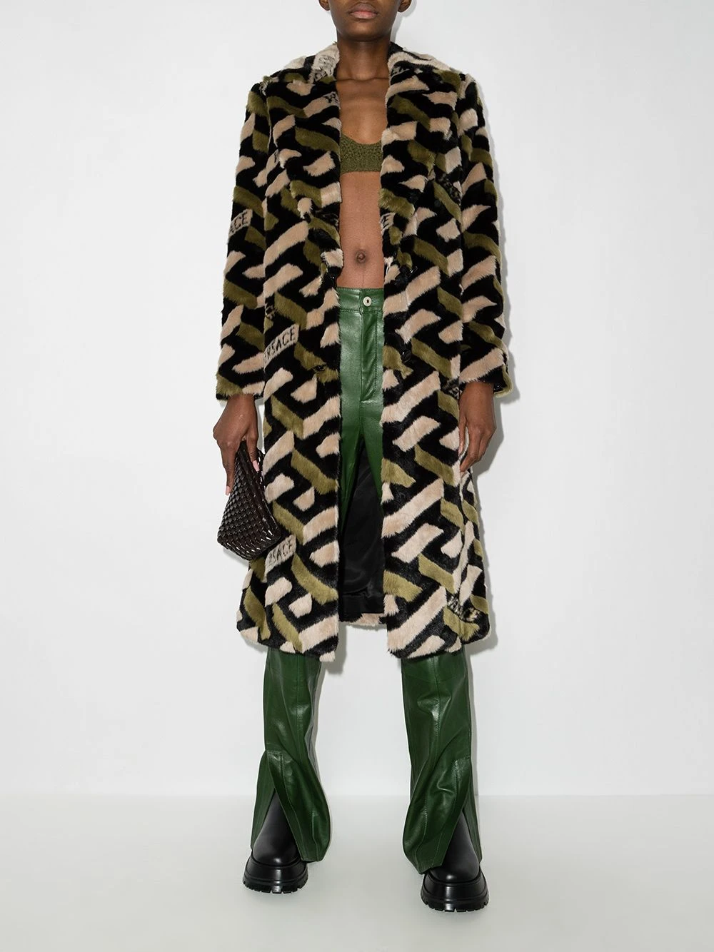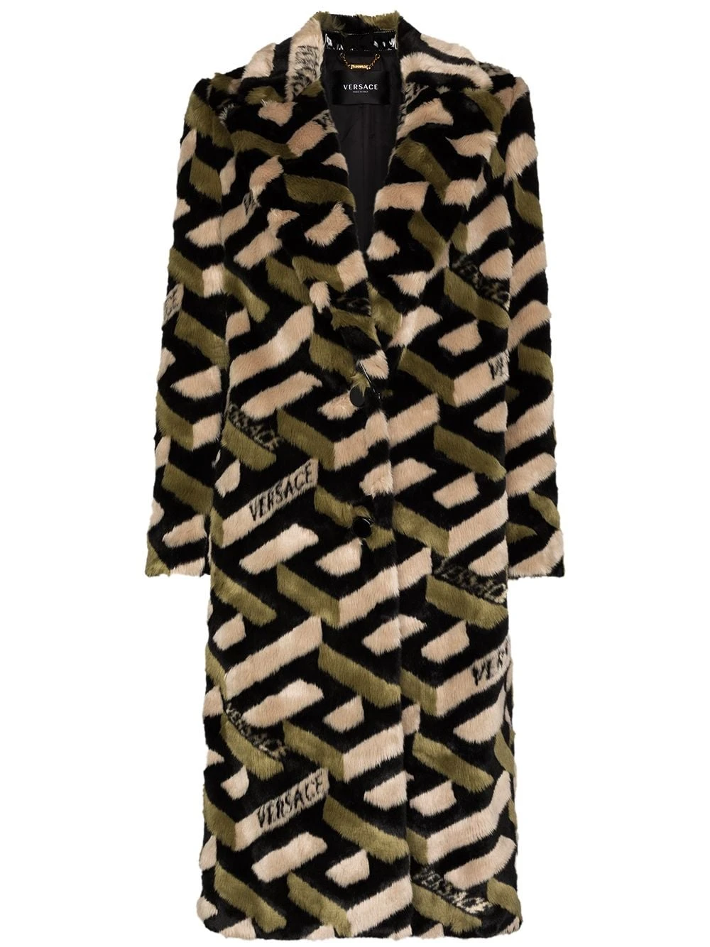 Motif Greca signature imprimé, larges revers crantés, boutonnière sur le devant, manches longues, deux poches passepoilées latérales, coupe mi-longue.