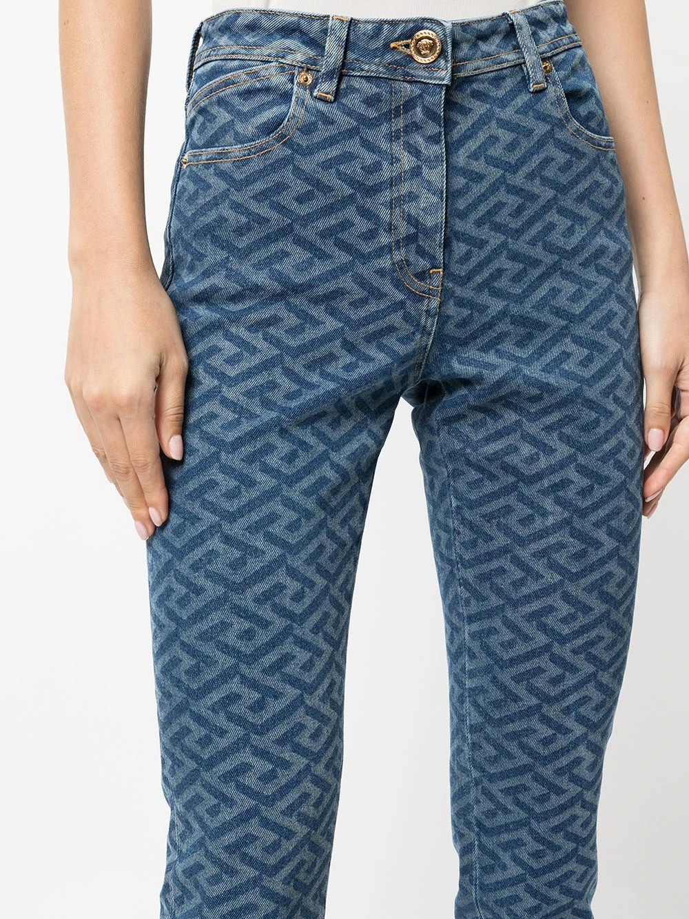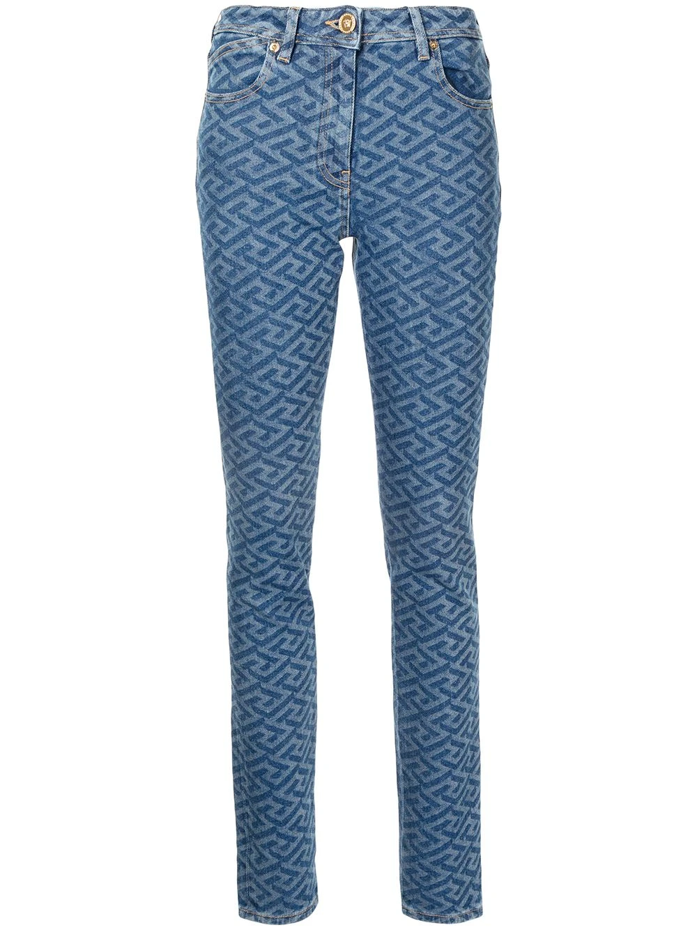 Motif Greca signature imprimé, boutonnière sur le devant, passants de ceinture, cinq poches classiques. Couleur : bleu.