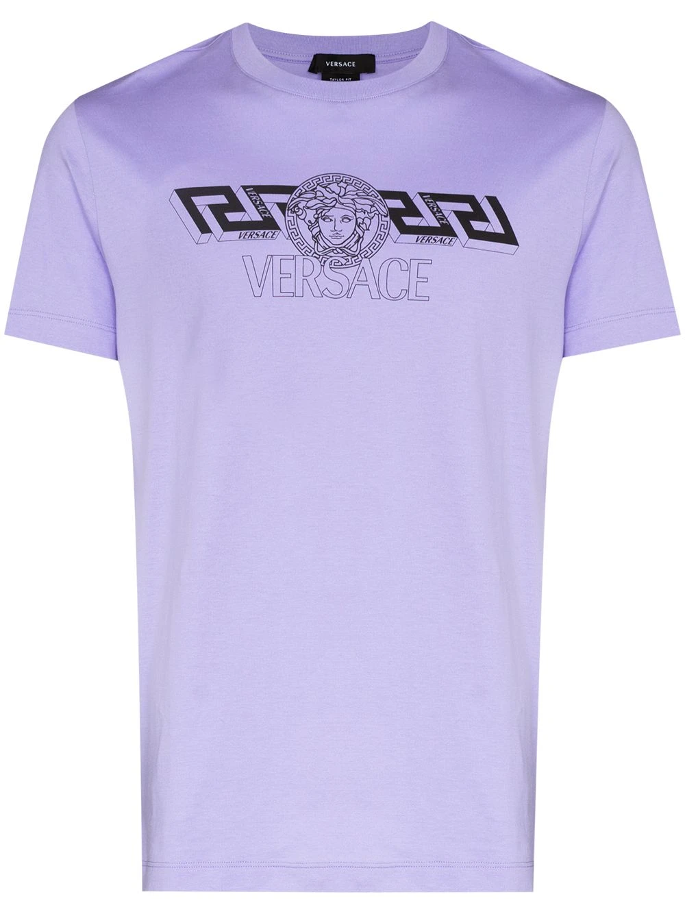 Lilac cotton Medusa Head logo-print T-shirt from VERSACE featuring Medusa Head motif, signature La Greca print, round neck, short sleeves and straight hem.