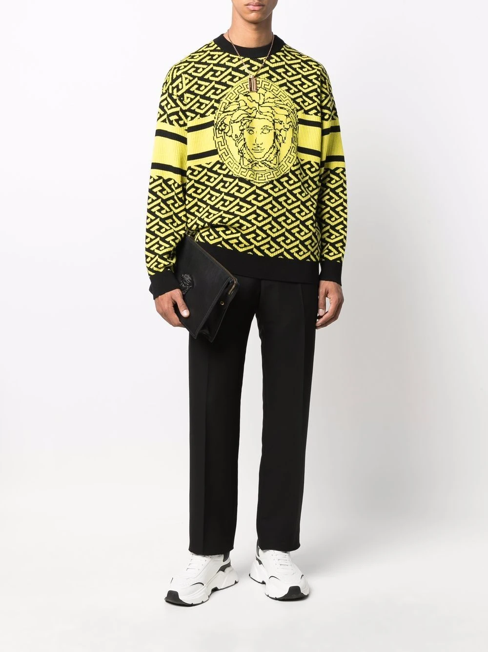 Imprimé La Greca signature, motif Medusa, jacquard à motifs, encolure ras du cou, épaules tombantes, manches longues, poignets nervurés, ourlet nervuré.