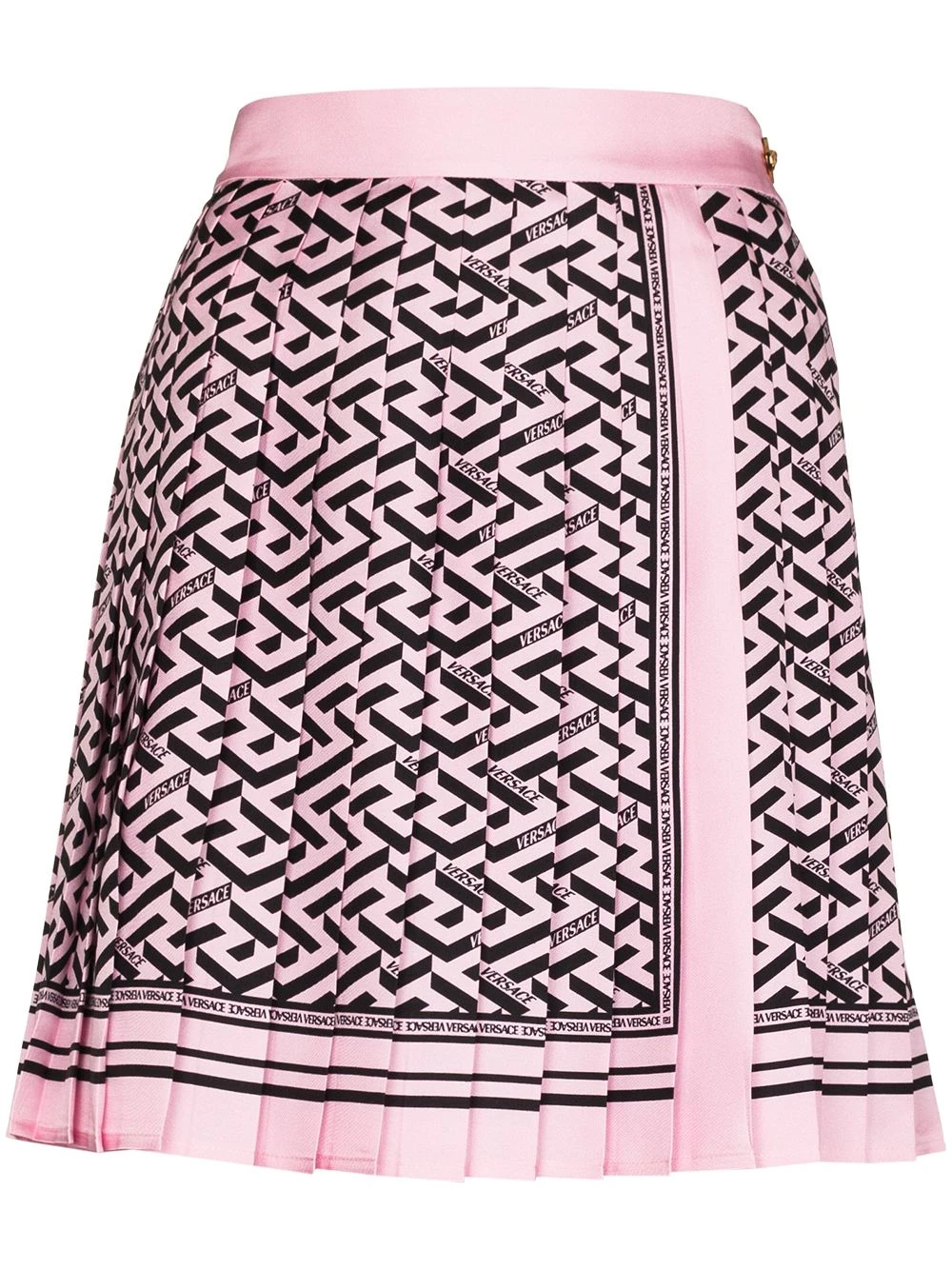 Design plissé, imprimé La Greca signature, fente sur le devant, taille haute, boutonnière sur le côté, ourlet droit. Matière : soie.