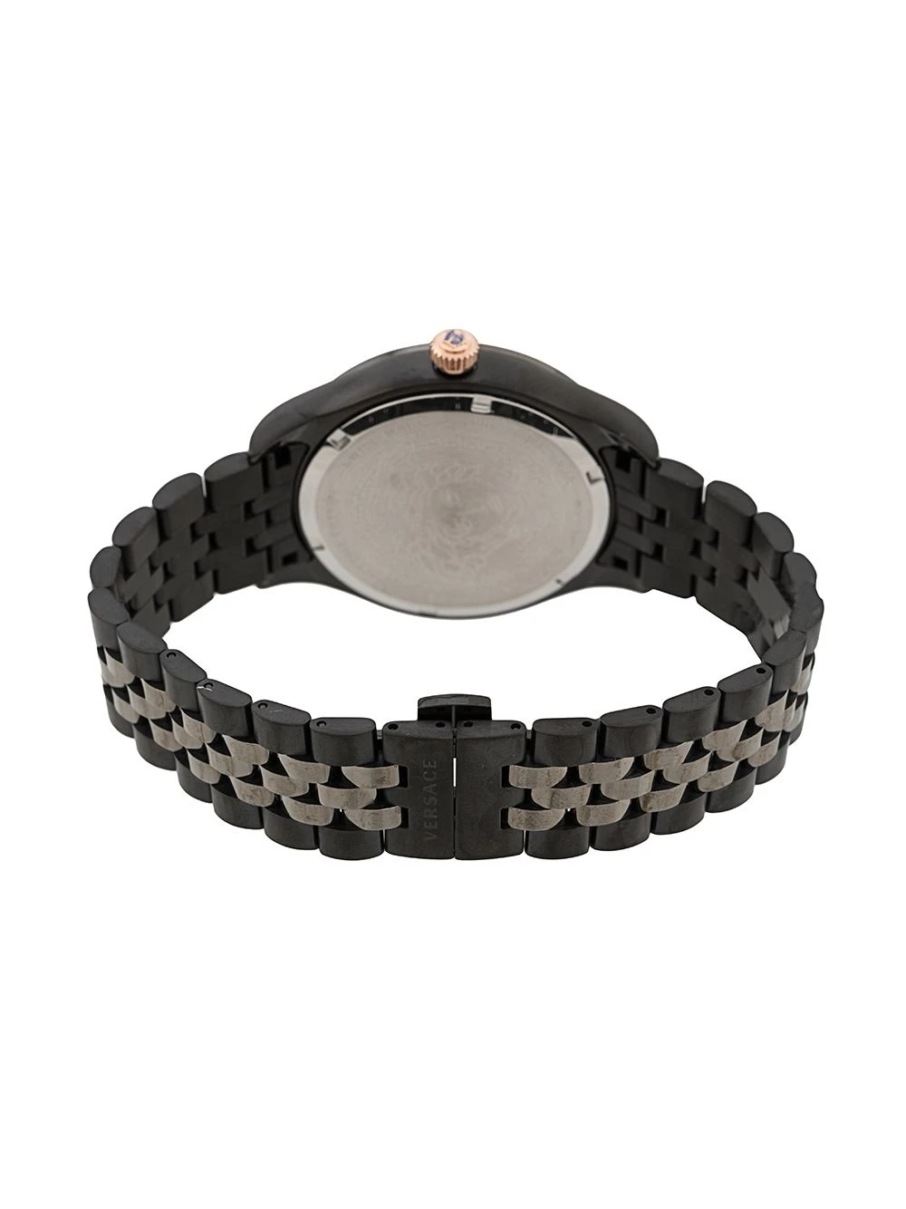 Boîtier rond, mouvement à quartz, bracelet à maillons ajustable. Couleur : noir. Matière : acier inoxydable.
