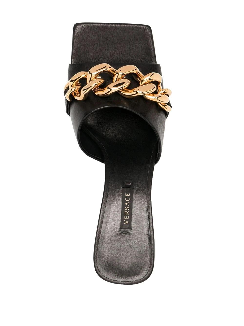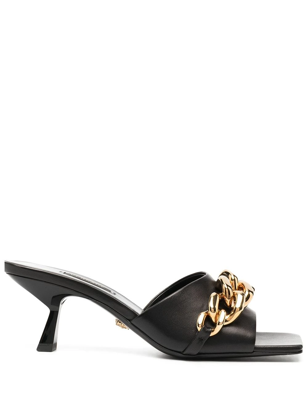 Maille jaseron, semelle intérieure à logo, design à enfiler, bout ouvert, talon mi-haut. Couleur : noir. Matière : cuir.