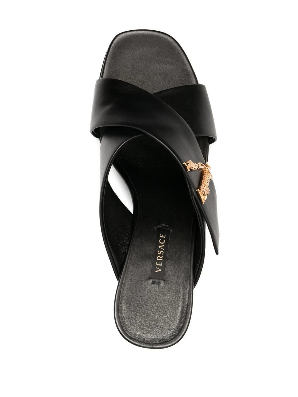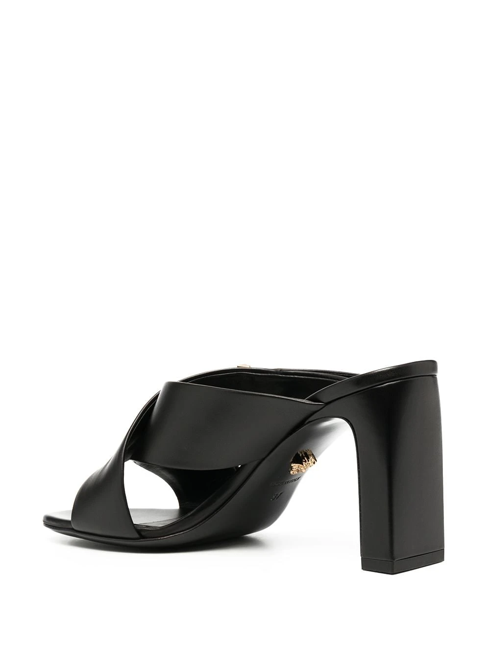 Plaque logo dorée, talon haut épais, semelle intérieure à logo, bout ouvert, détail de brides croisées. Couleur : noir. Matière : cuir.