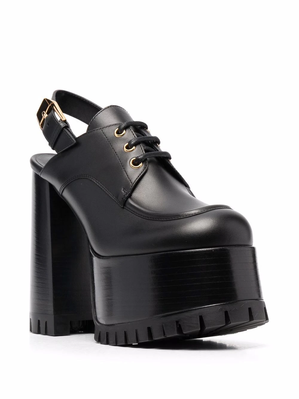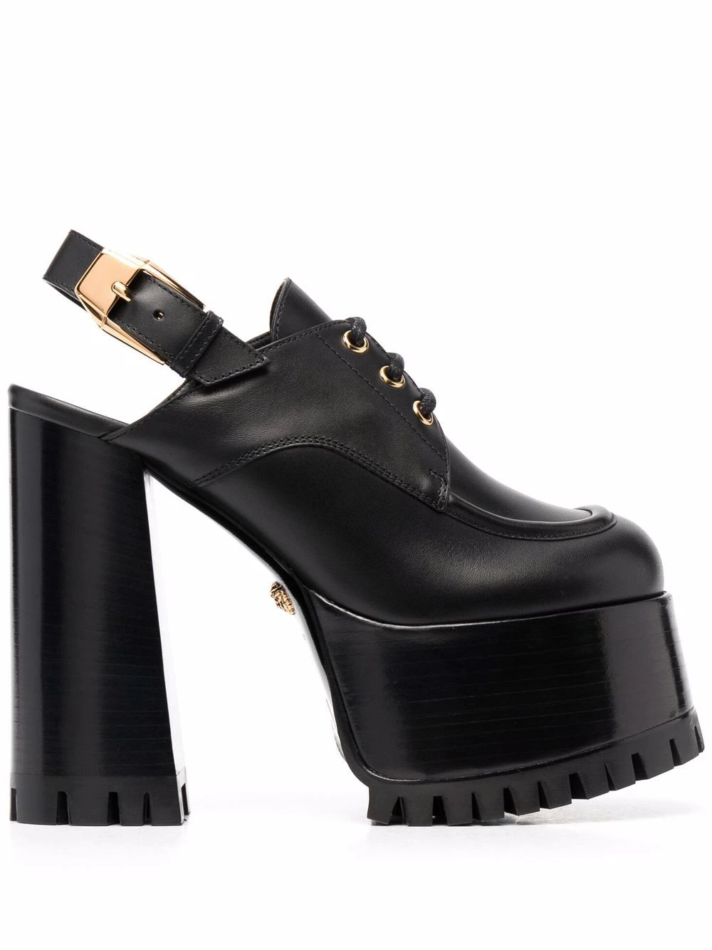 Finitions en métal doré, motif Medusa, design à empiècements, bout rond, détails en dentelle, bride arrière à boucle, semelle à plateforme, talon haut épais. Couleur : noir. Matière : cuir.