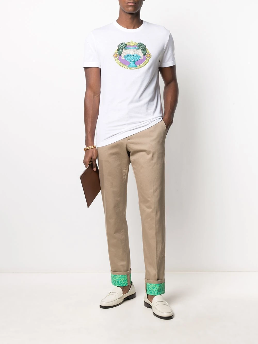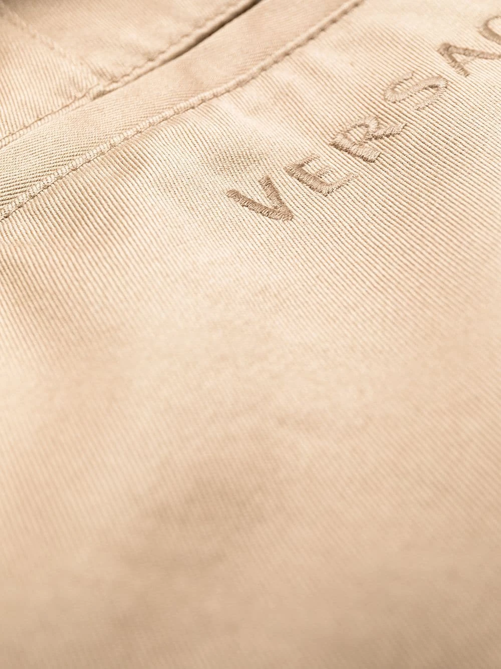 Fermeture boutonnée, passants de ceinture, deux poches latérales passepoilées, poches arrière passepoilées, logo brodé à l’arrière. Matière : coton.
