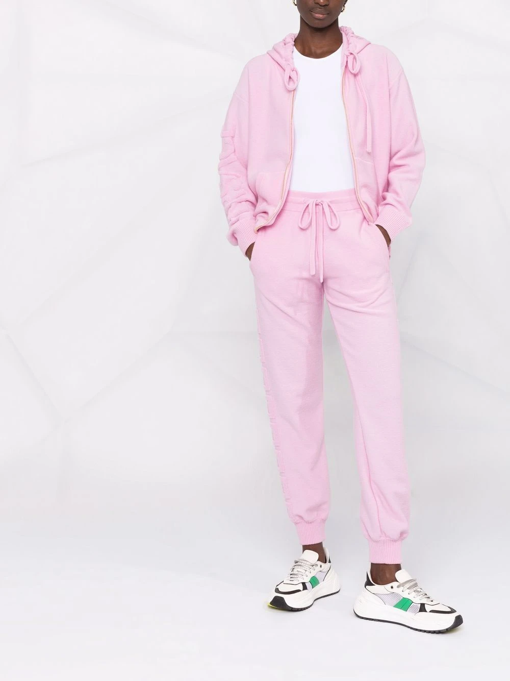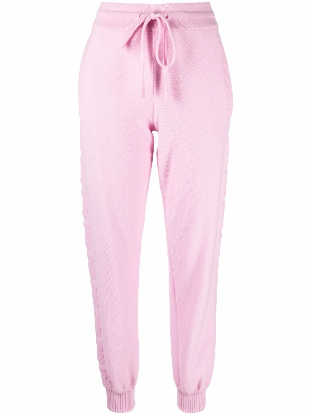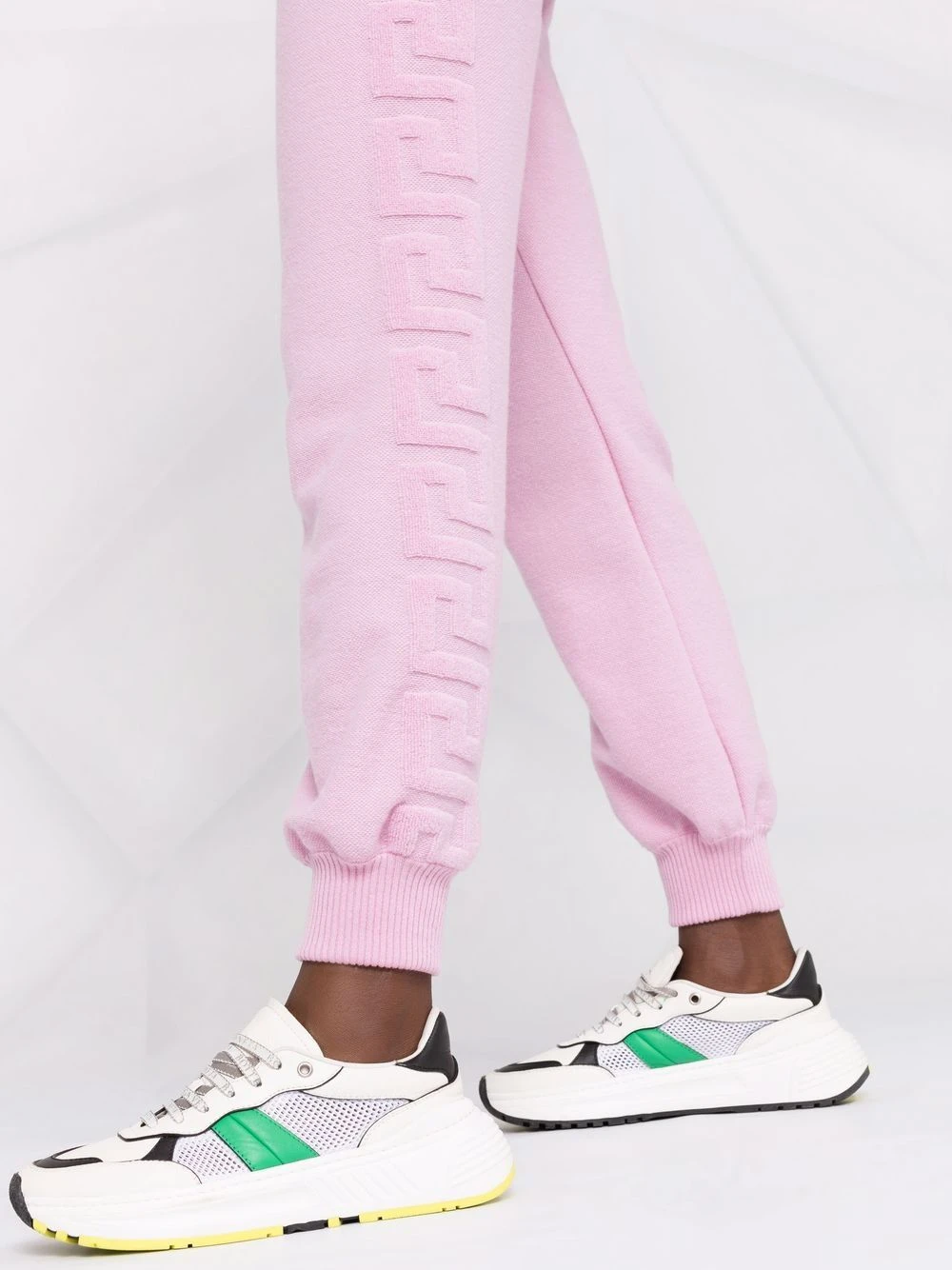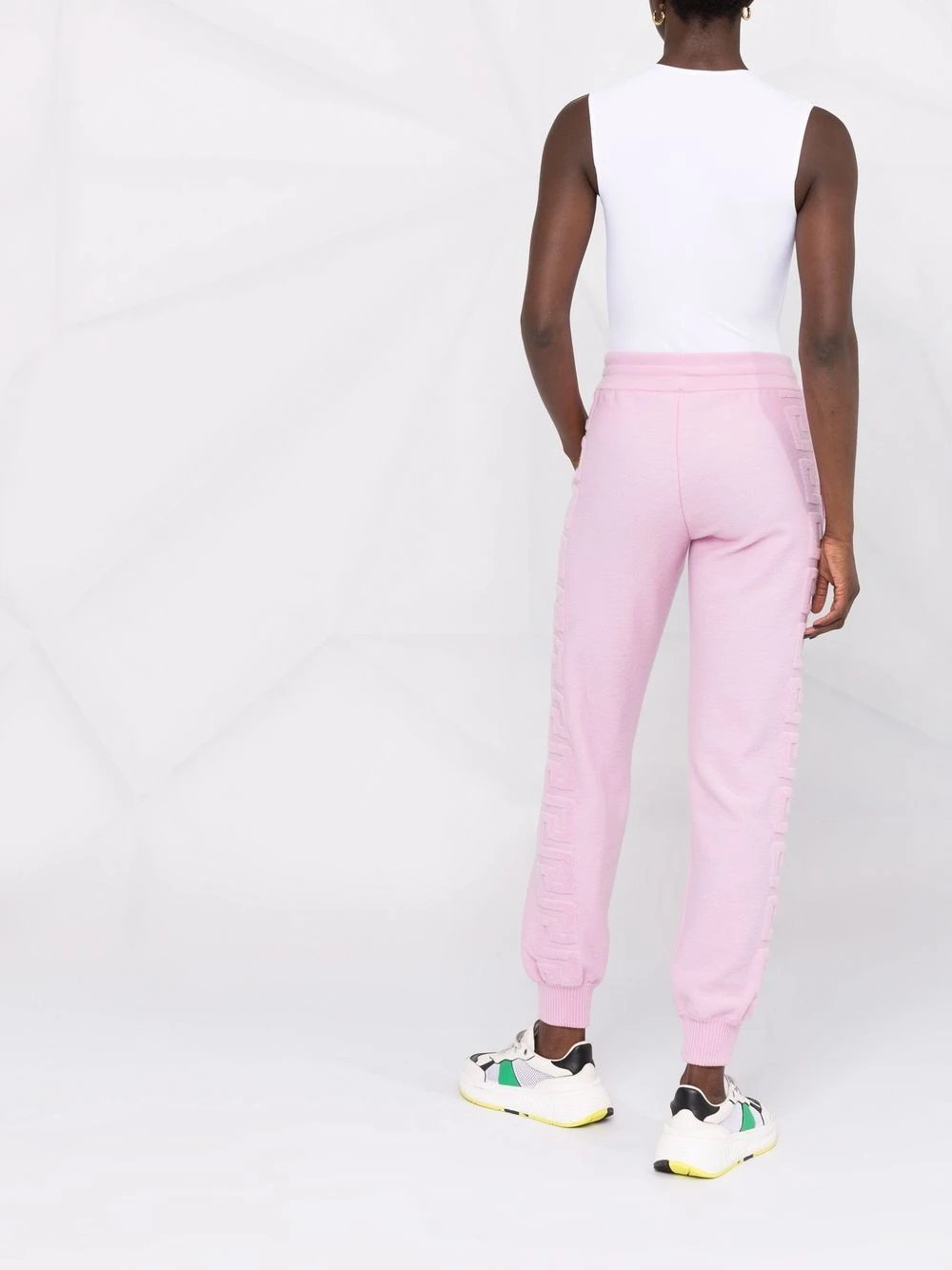 Détail Greca signature, taille élastique à lien de resserrage, deux poches latérales fendues, chevilles élastiques. Couleur : rose.