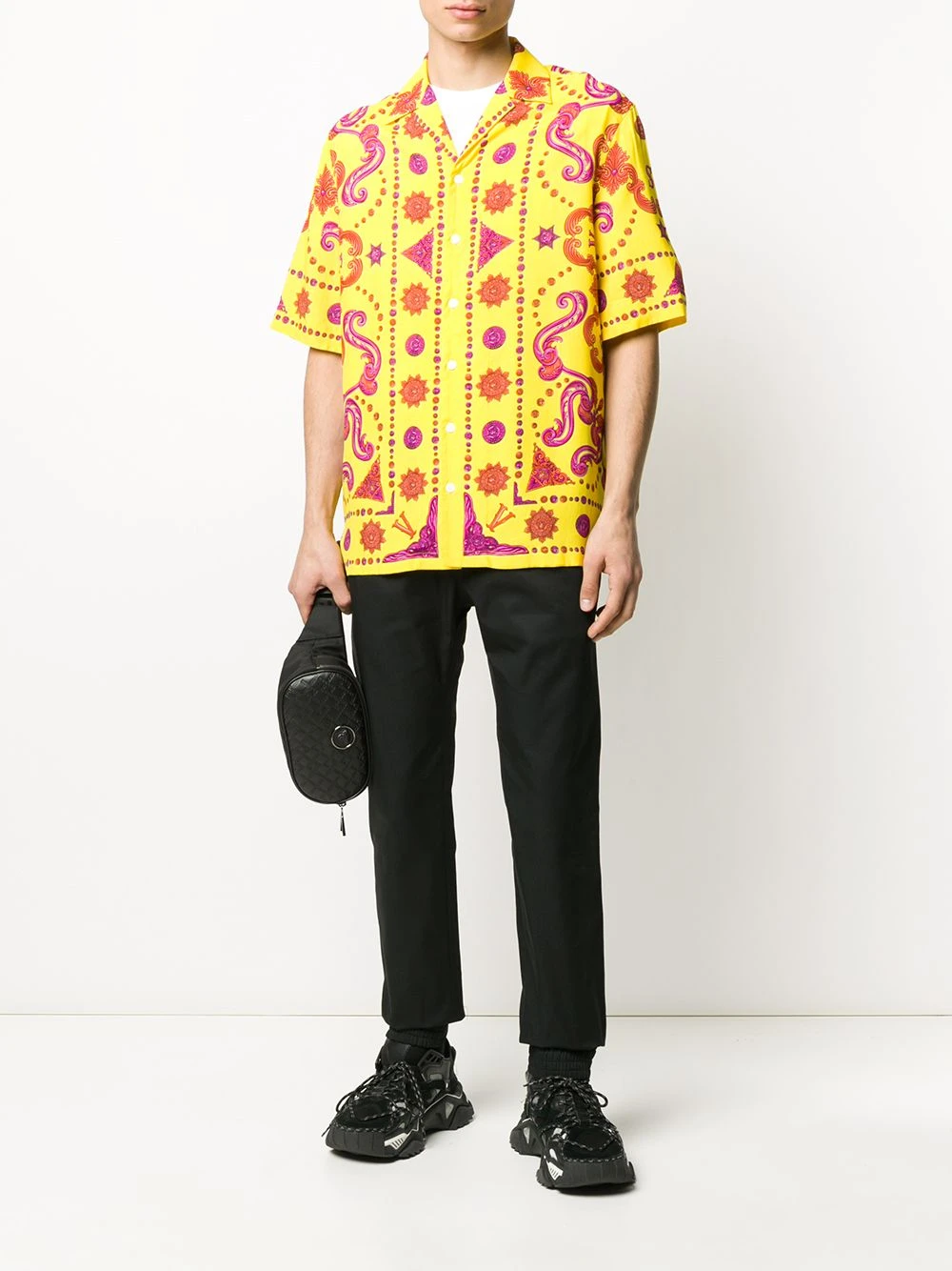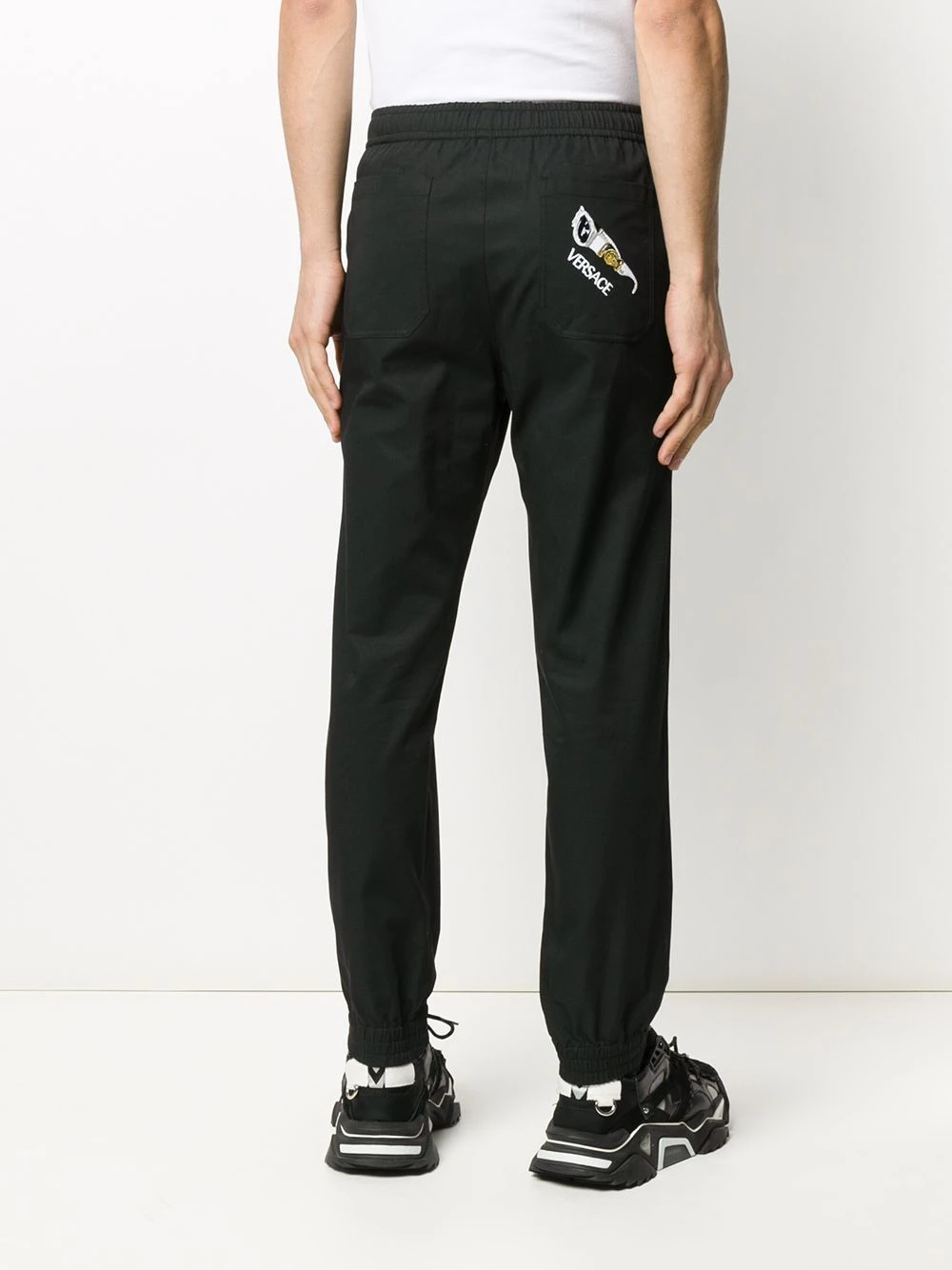 Pantalon de jogging à logo Medusa Biggie en coton Versace avec ceinture élastique, coupe slim, chevilles resserrées, logo brodé à l’arrière et poches arrière plaquées. Couleur : noir.