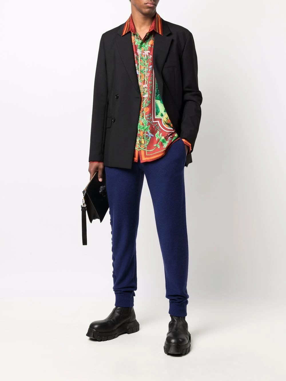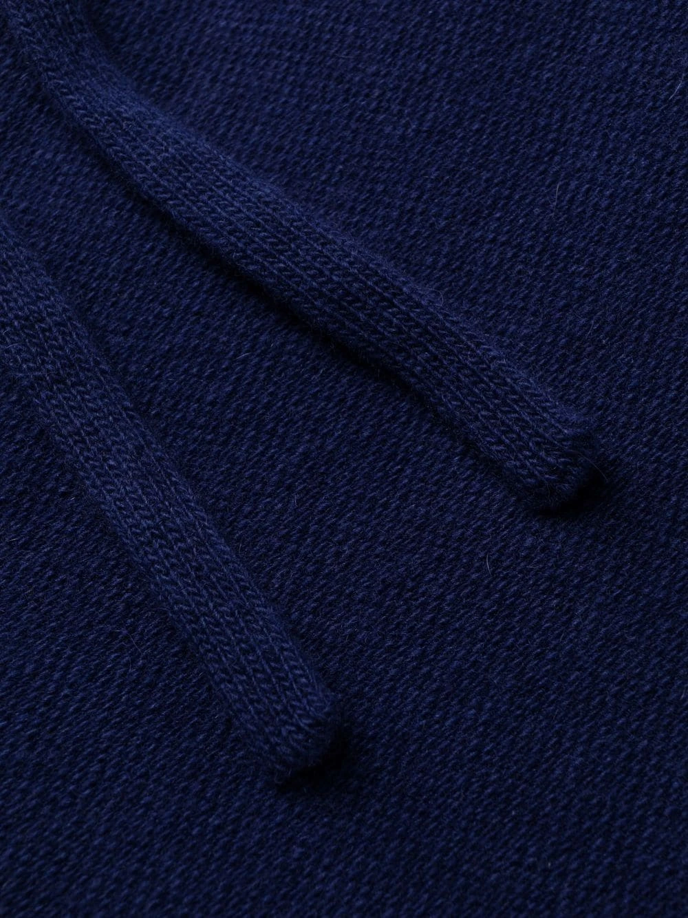 Design tricoté, coupe fuselée, lien de resserrage à la taille, taille mi-haute, deux poches latérales fendues. Couleur : bleu.