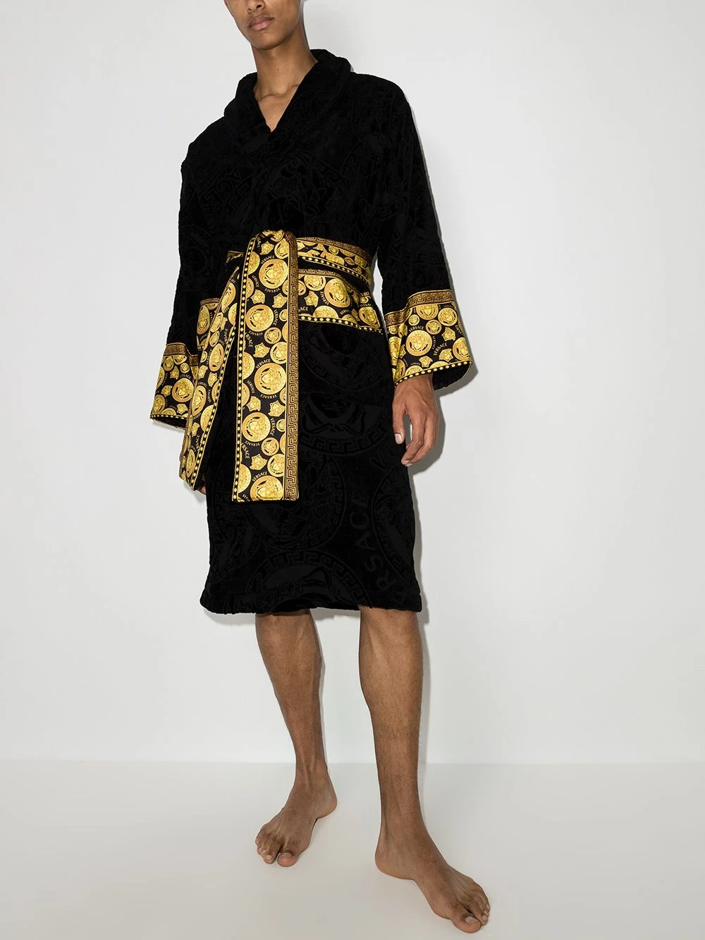 Motif Medusa, fini éponge, taille ceinturée, col v, manches longues, deux poches latérales plaquées, coupe mi-longue. Matière : coton.
