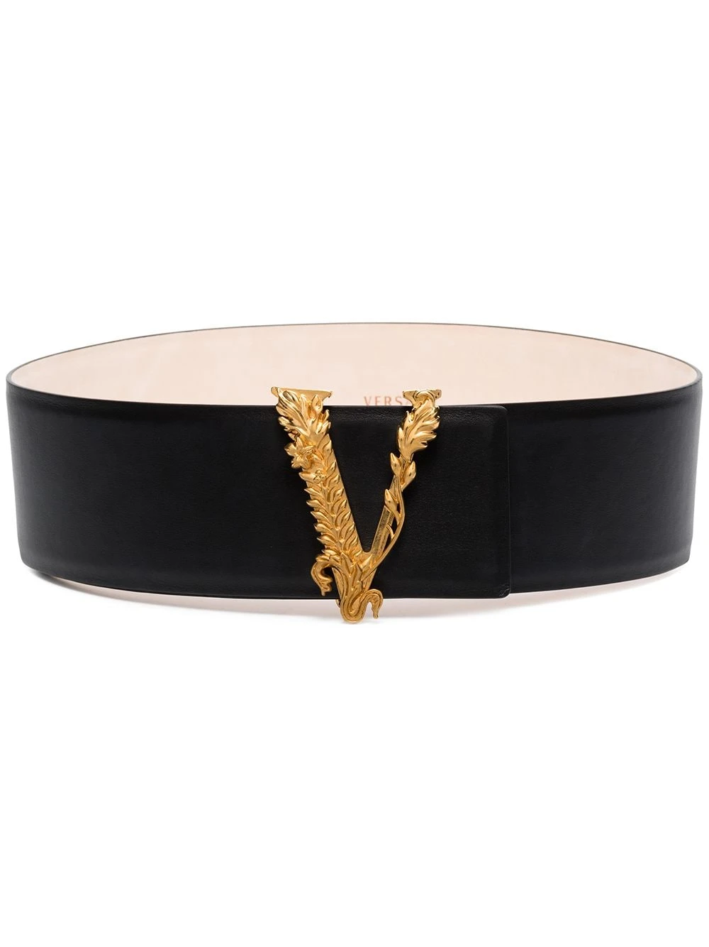 Ceinture Virtus en cuir Versace avec plaque logo dorée. Couleur : noir.