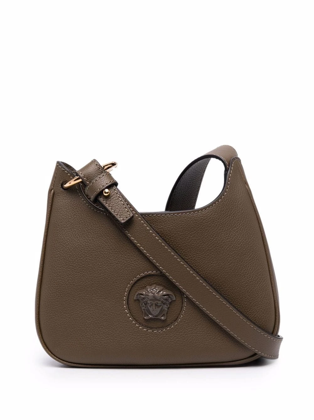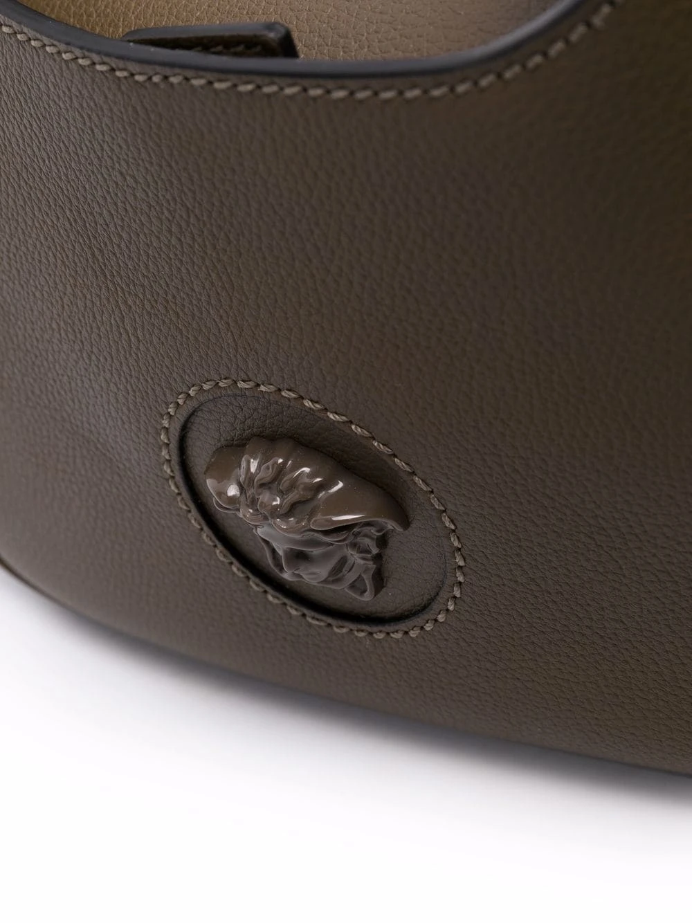 Texture grainée, logo imprimé à l’arrière, motif Medusa, bride porté épaule ajustable. Matière : cuir de veau.