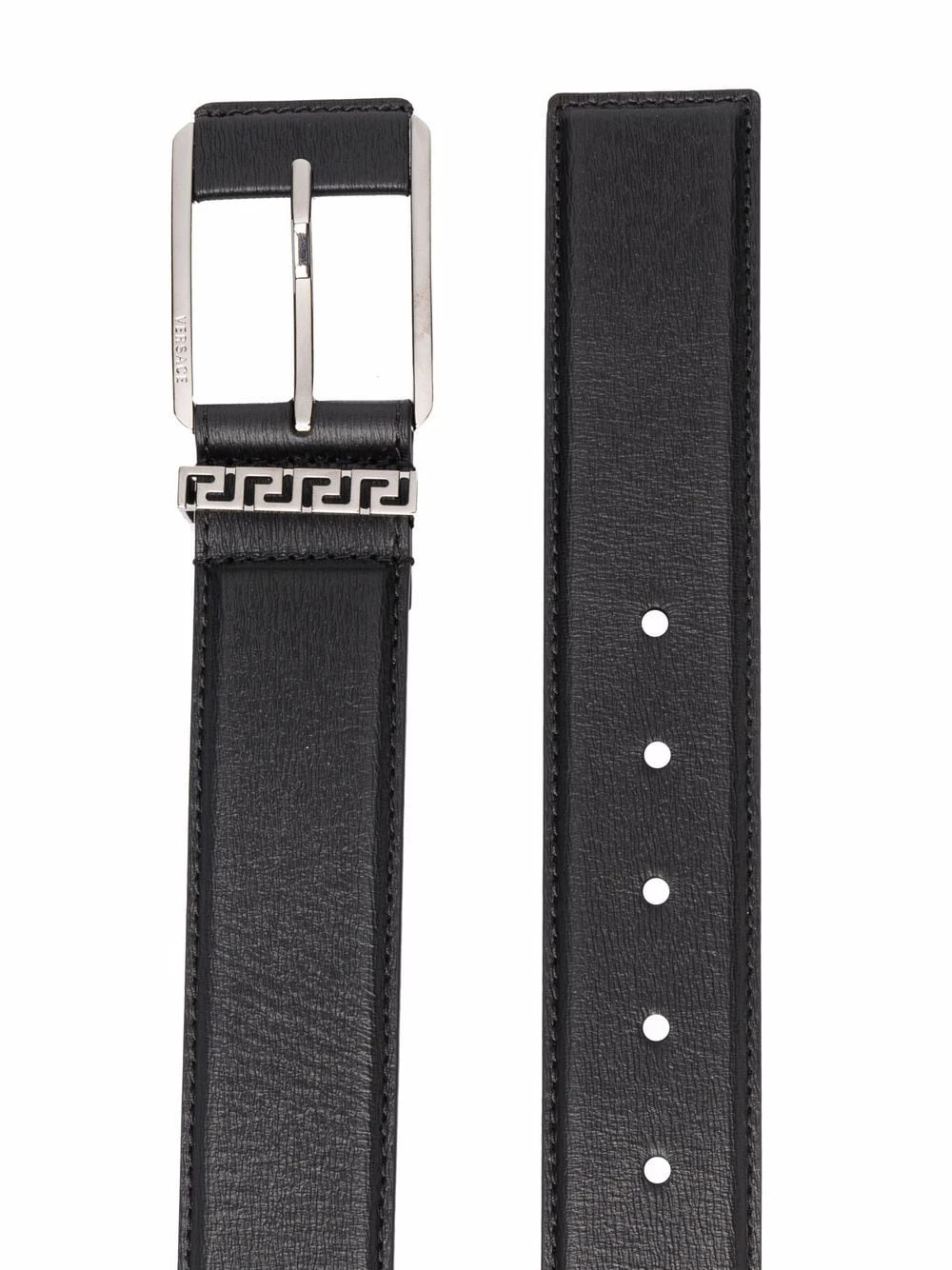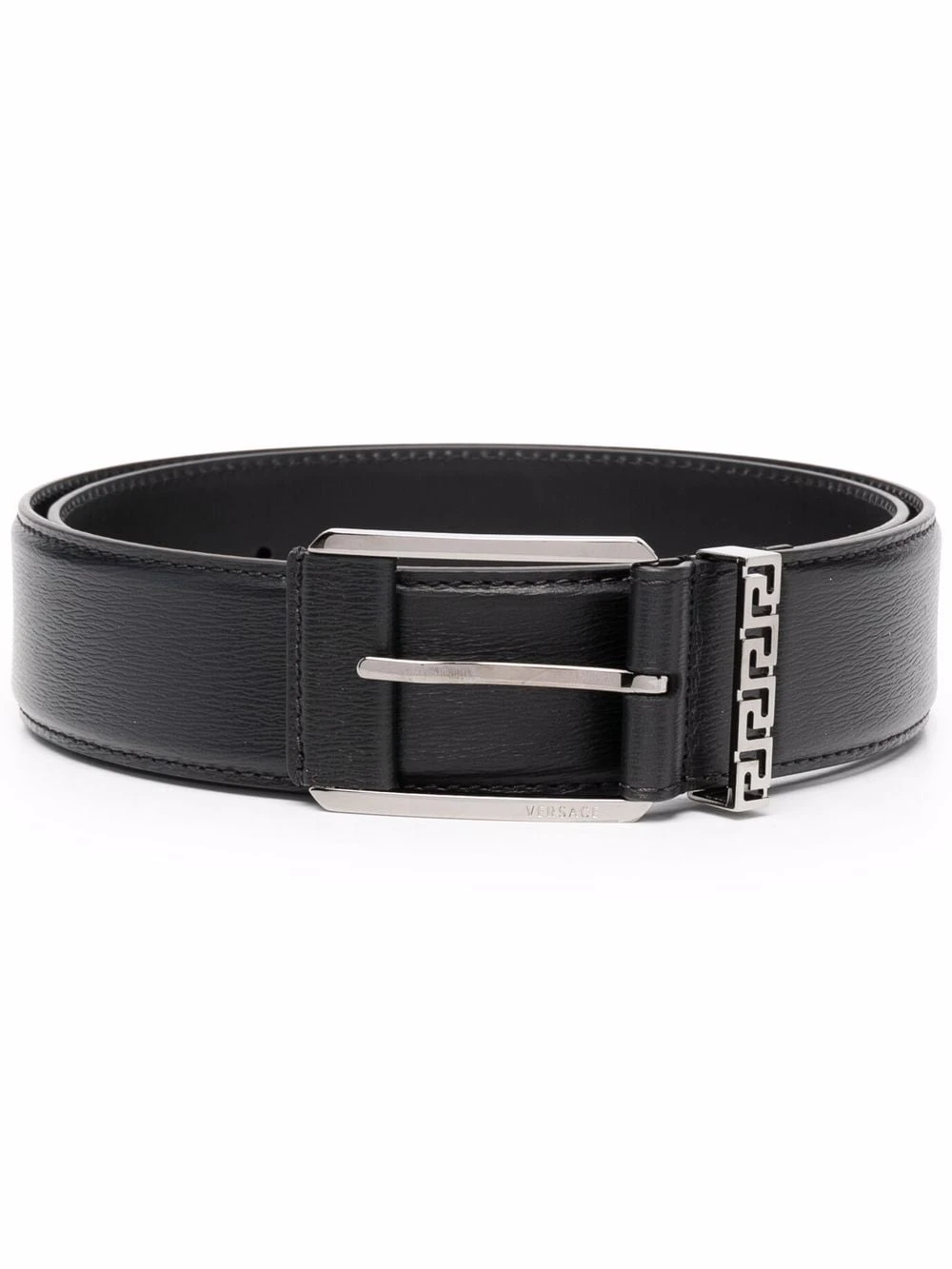 Ornements argentés, détail Greca signature, logo gravé, fermeture à boucle, trous percés, taille ajustable. Couleur : noir. Matière : cuir.