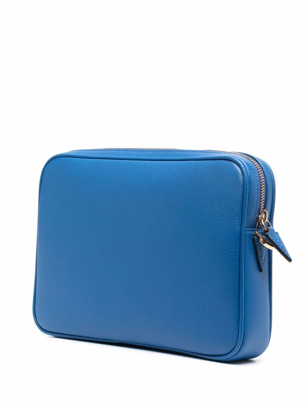 Patch logo sur le devant, fermeture zippée sur le dessus, compartiments intérieurs pour carte, logo doré. Couleur : bleu. Matière : cuir.