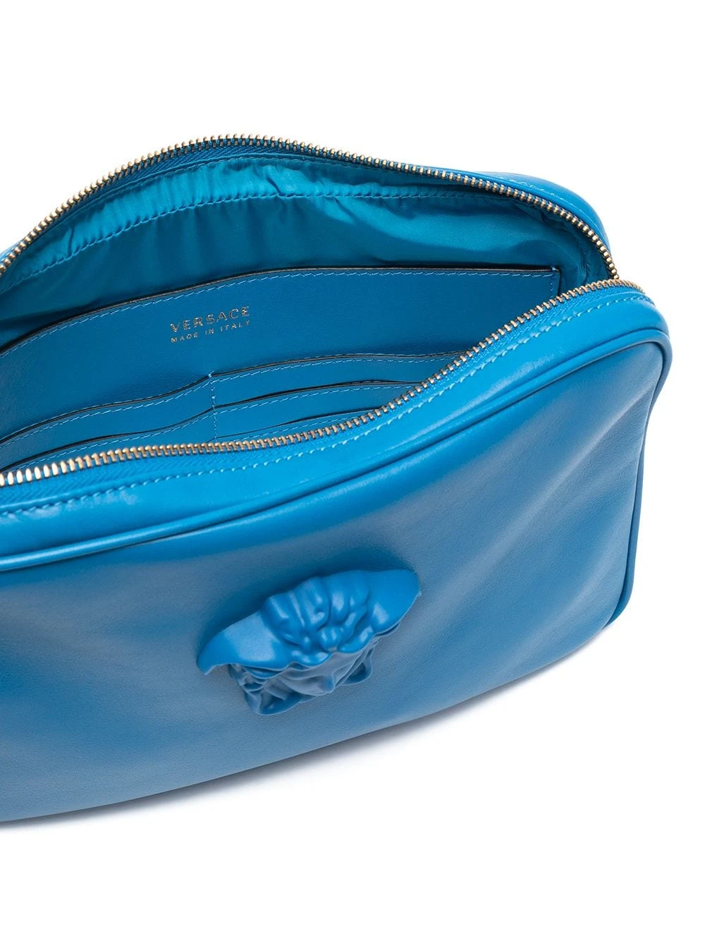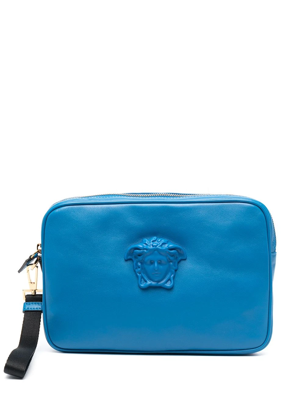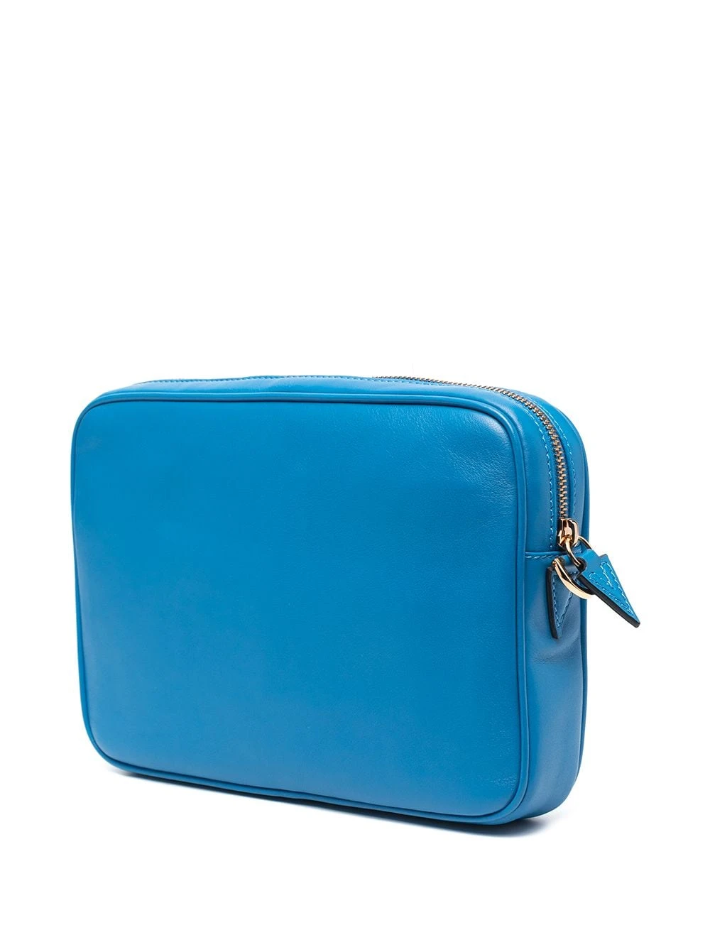 Fini mat, fermeture zippée tout autour, compartiments intérieurs pour carte, logo imprimé à l’intérieur, bride portée poignet. Couleur : Bleu. Matière : cuir de veau.